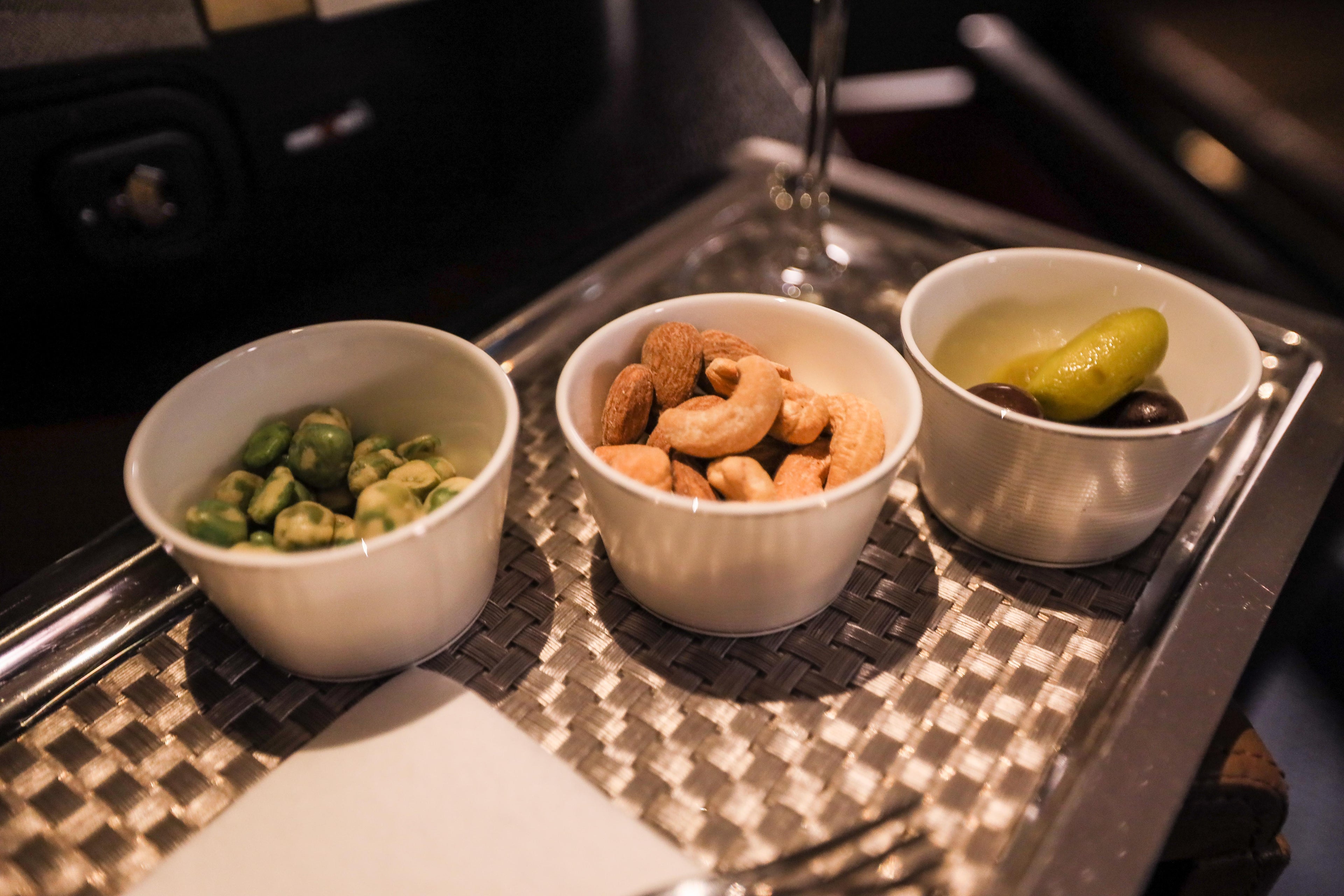 Shortly after takeoff, Charles Heidsieck 2006 Champagne was served along with a snack selection of wasabi peas, mixed nuts, cornichons and olives. I really appreciate a varied snack selection with a drink. A couple of almonds simply wouldn't have cut it in the Apartment!