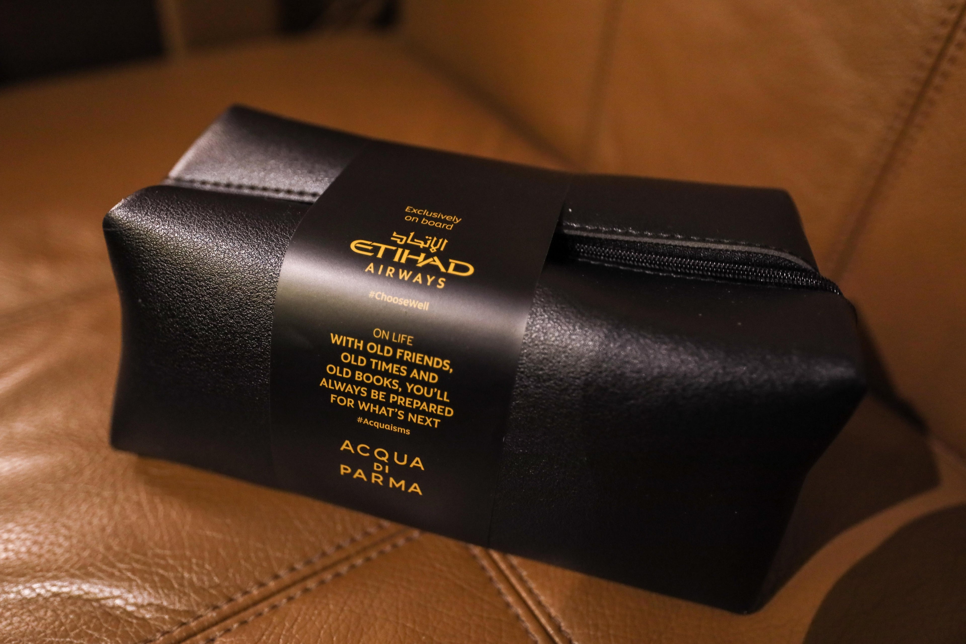 Acqua di Parma amenity kits were handed out at the start of the flight. They included lip balm, lotion, cologne, a toothbrush and toothpaste, a pair of socks and an eye mask (which was nice on the inside but a bit cheap and tacky on the outside).