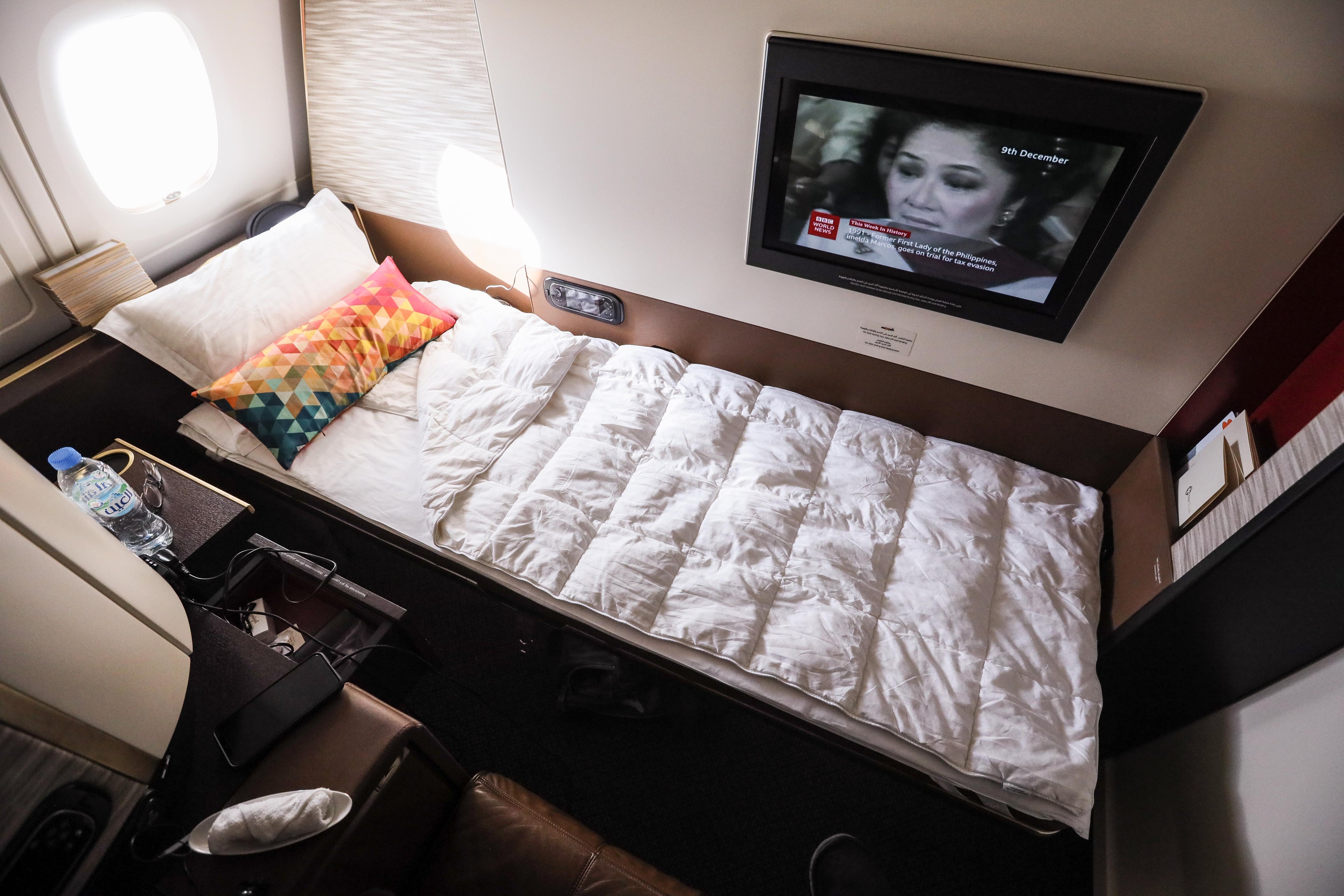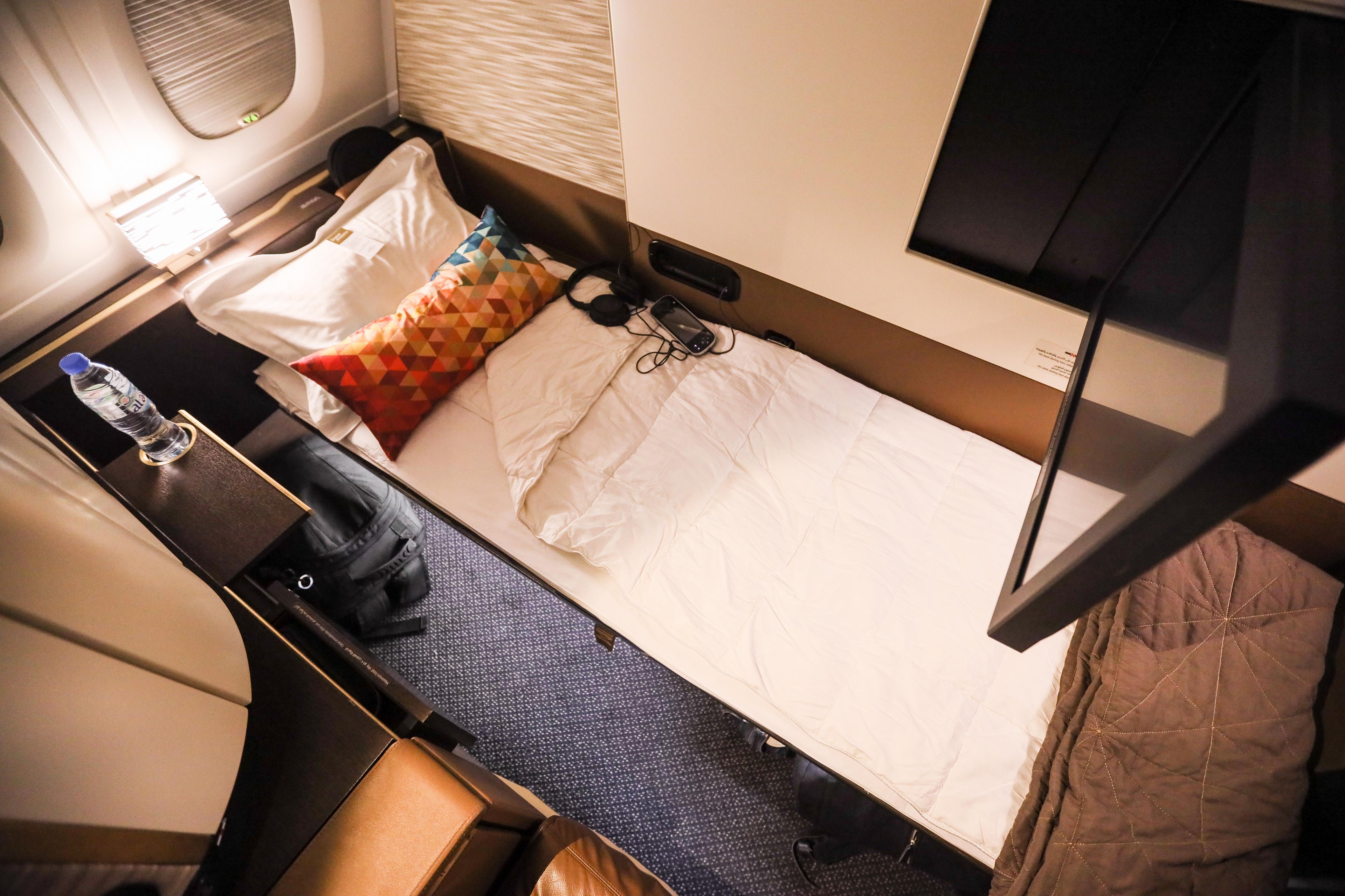 A couple of hours into the flight, I asked the crew to make up the bed. The bench, which is split in two, is dropped down to make one flat surface. Two mattresses are put on top of the flattened bench, and it is then made up with a soft and comfortable comforter and pillow set.
