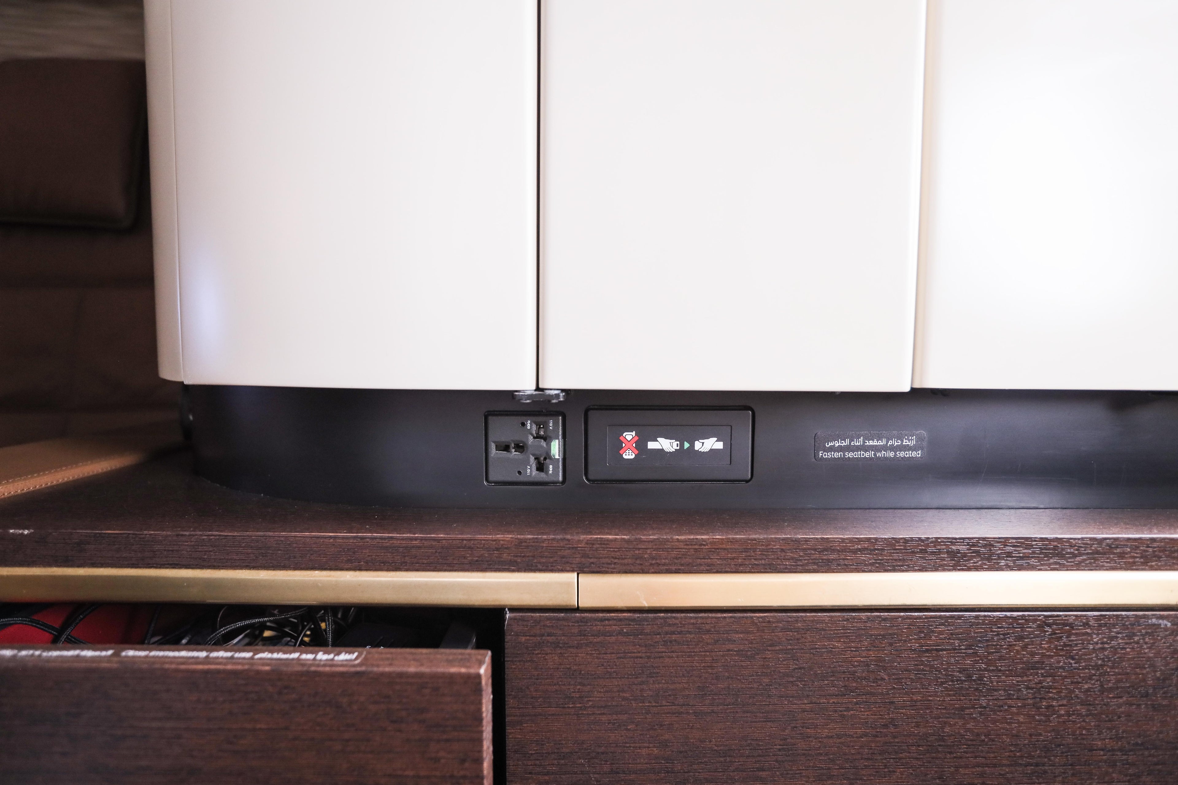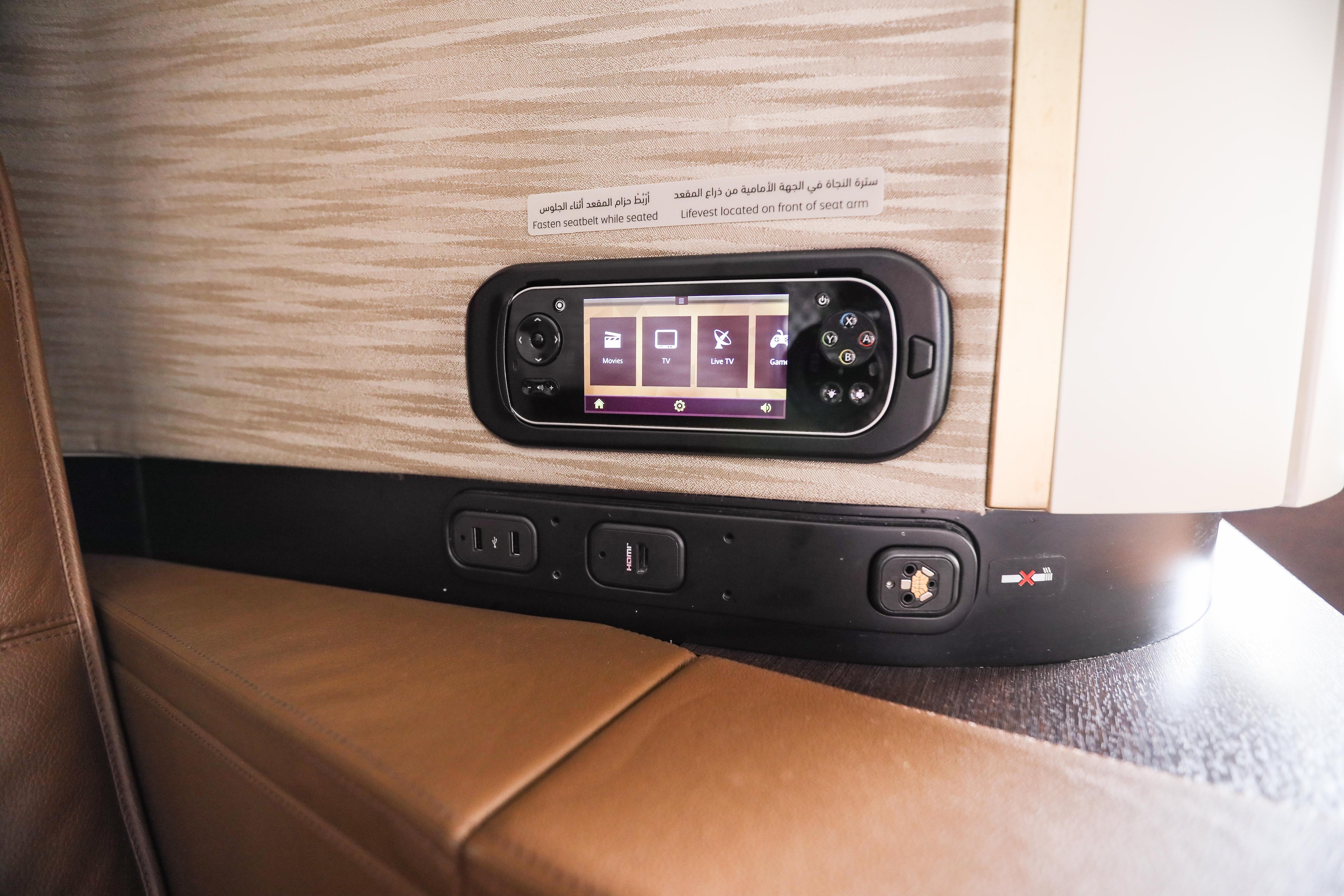 There is a control panel to the left of the seat that allows easy control of the inflight entertainment (IFE), next to a double USB port, an HDMI port, and the outlet for headphones. There is another outlet for the headphones next to the bed so that you can listen to the IFE regardless of where you are in the Apartment.