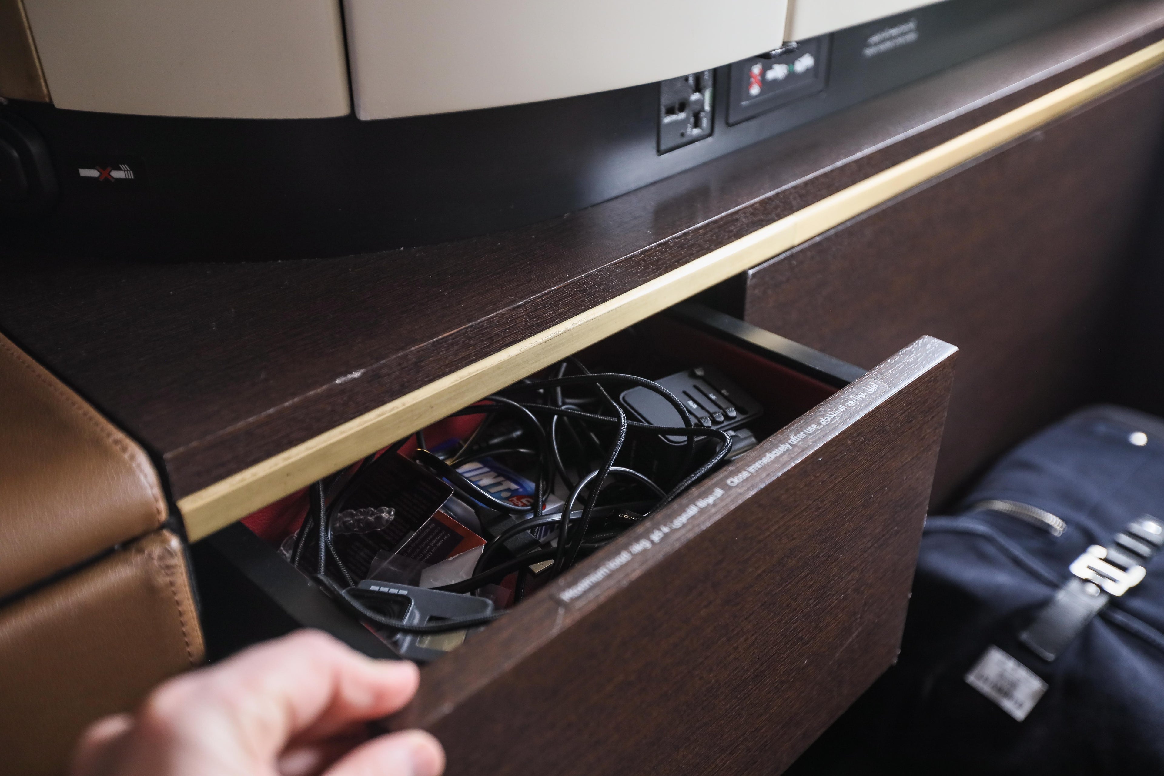 There is also a handy drawer right next to this, where I kept my growing tangle of wires between charging. It's in the perfect position, with a universal power outlet right above.
