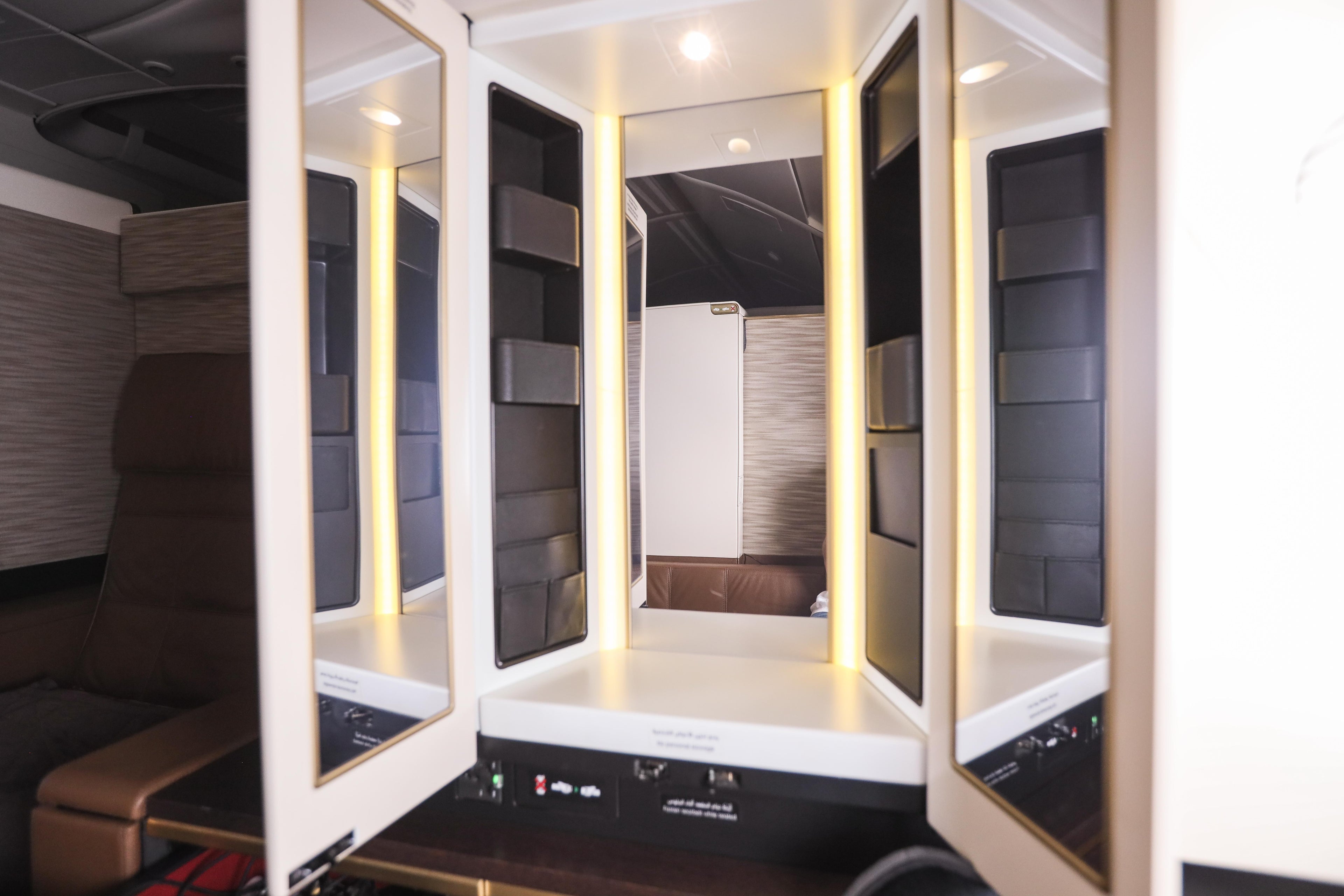 A pop-open vanity station is next to the seat, with various mirrors and storage pockets. It's incredibly well lit.