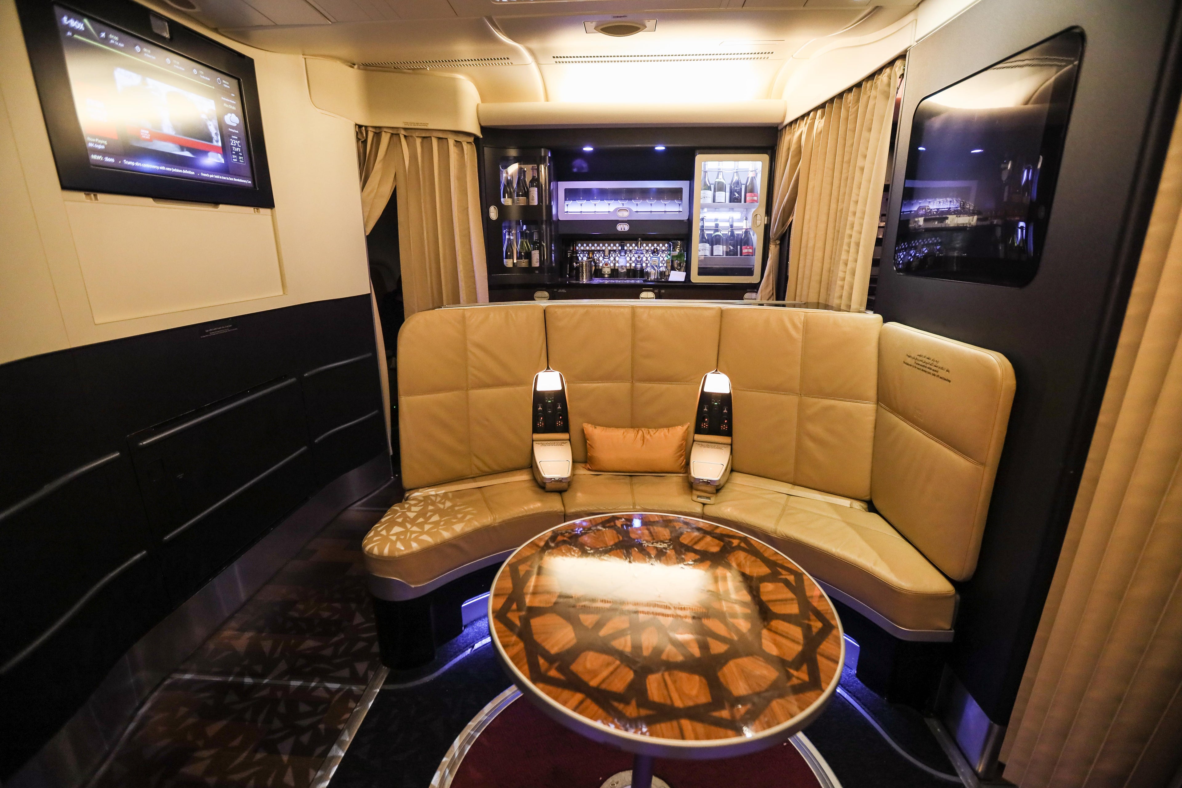 Between the first- and business-class cabins in the middle of the upper deck on the Etihad A380 is a lounge area. There is a round table with six comfortable seats around it. It's a wonderful place to chill, chat and drink during the flight.
