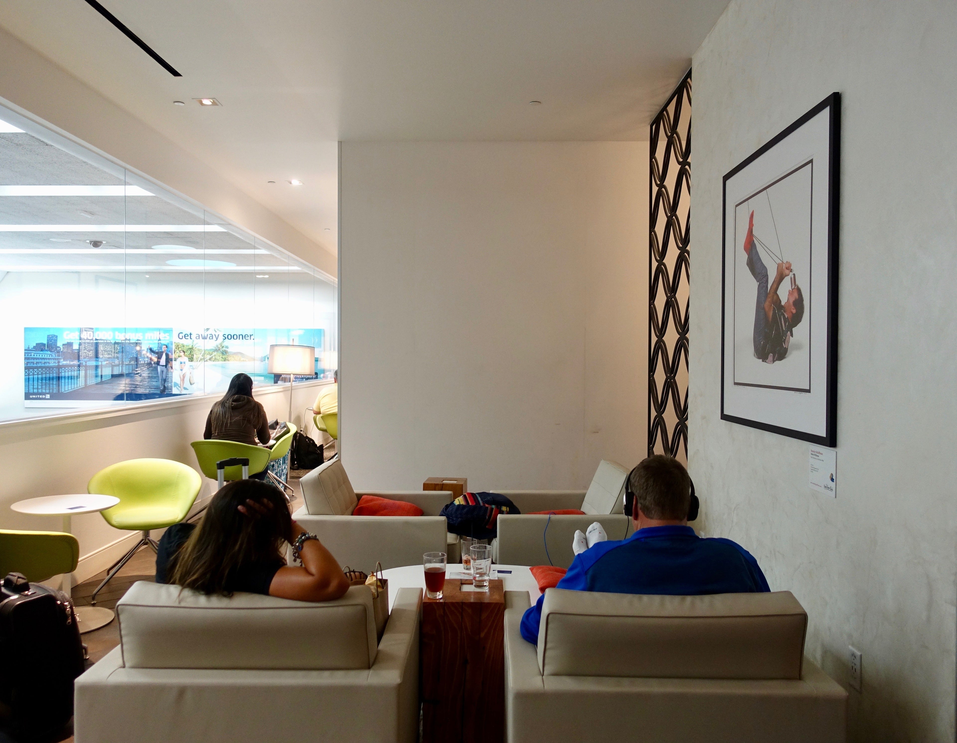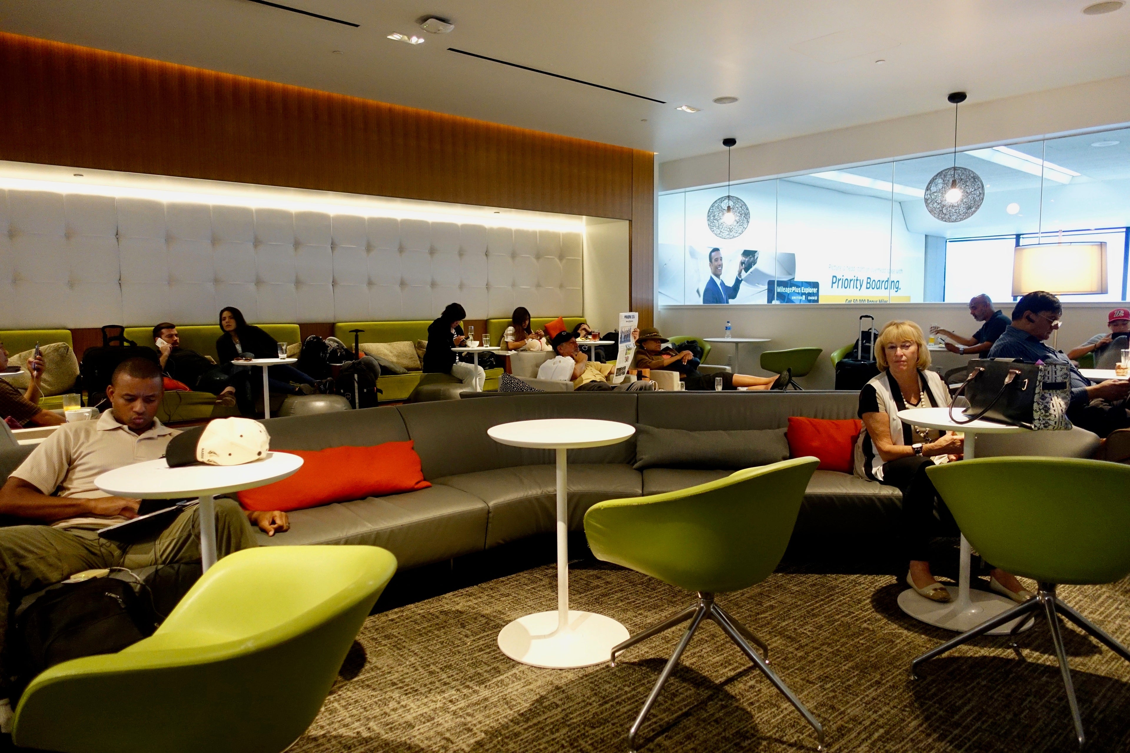 I entered the lounge at 11:40am and it was already more than half full — there were about 90 people and there's enough seating for 145. A main seating area offers multiple types of couches and chairs for visitors' work and lounging needs.