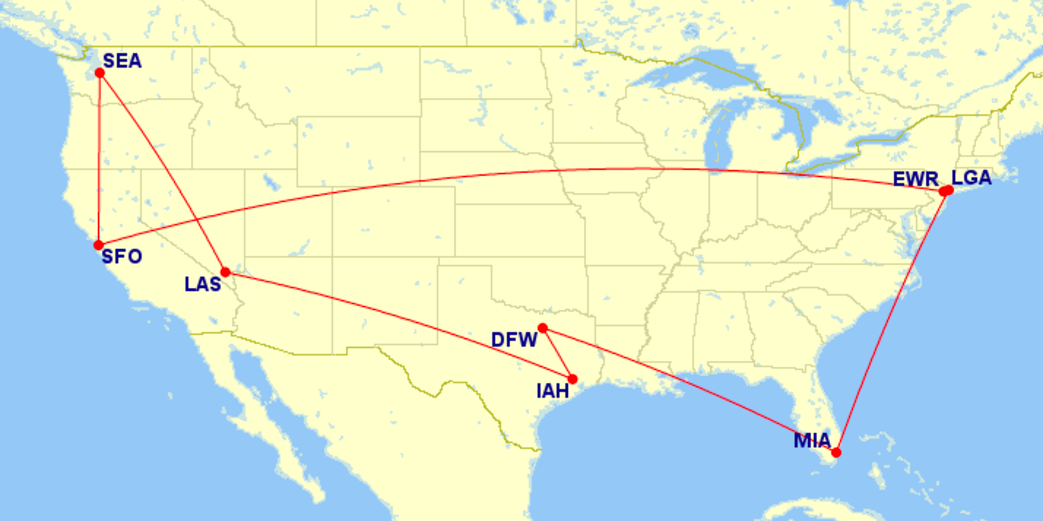 We wanted to find out for ourselves: Are the Centurion Lounges living up to the hype or succumbing to the same fate as other domestic lounges? In typical TPG fashion, I spent the first week of August traveling 7,500 miles and reviewing every single Centurion Lounge in the US. You can find Centurion Lounges in San Francisco (SFO), Seattle (SEA), Las Vegas (LAS), Houston (IAH), Dallas (DFW), Miami (MIA) and New York (LGA) — a new one in Philadelphia (PHL) is set to open later this year. Here's a look at the route I took: