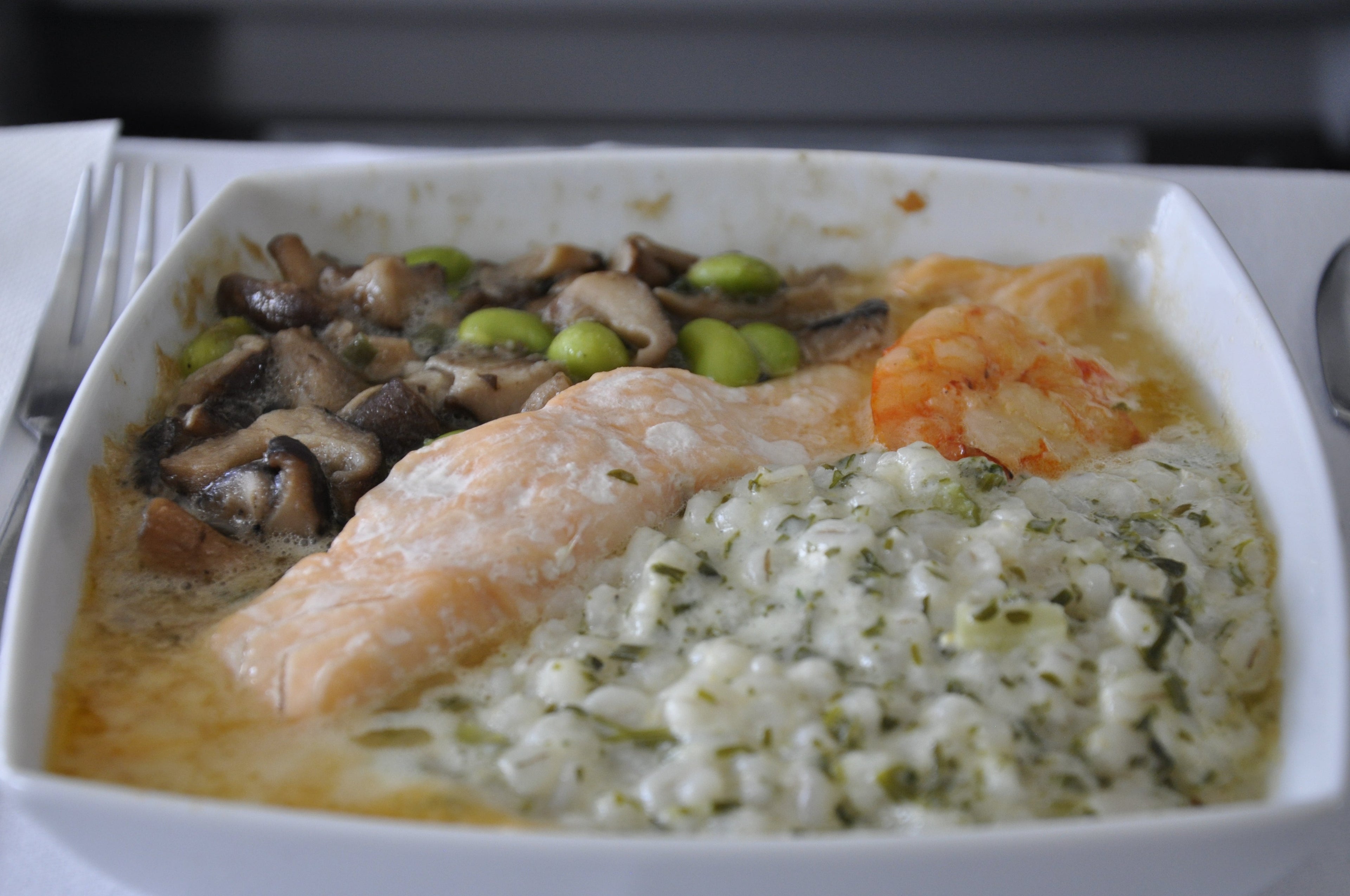 For my entree, I selected the salmon filet with scampi (note: one shrimp) with white wine sauce, Shiitake mushrooms with soy beans, and pearl barley with parmesan. The filet was cooked beautifully — flaky on the fork and evenly heated. The pearl barley reminded me of risotto and the parmesan within made it an excellent addition. While the presentation of the dish wasn't the most attractive, in terms of flavor and satisfaction, it was one of the best airline meals I've ever been served.