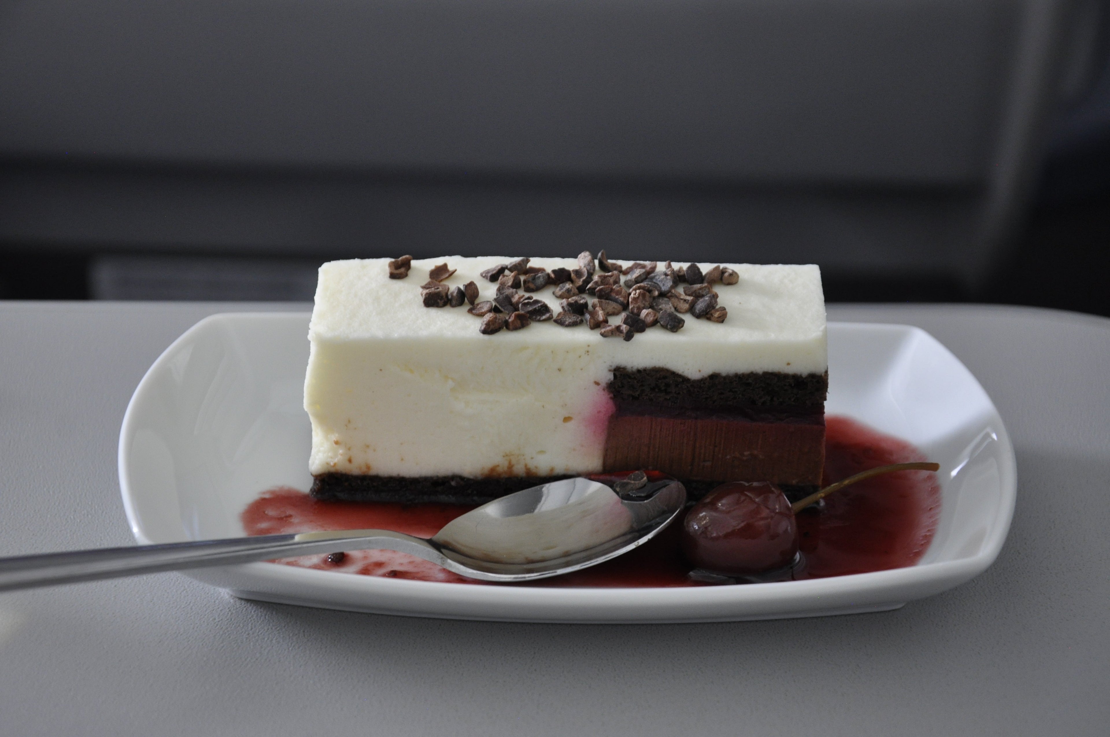Dessert was a black forest gateau with red berry sauce, with which I enjoyed some Bailey's Irish Cream over ice. I didn't feel that the cart service for the food and beverages subtracted from the experience. It's more important to me to have a drink available to me when I want one than the matter in which it's served.