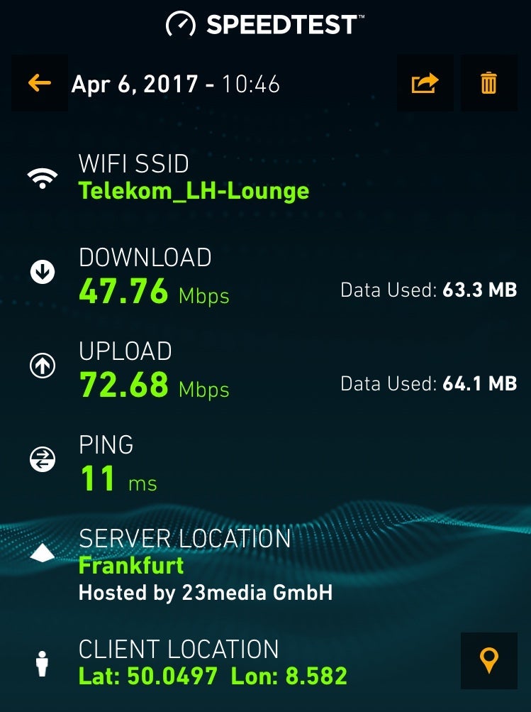 I spent just under 20 minutes in the lounge, but gave the Wi-Fi a quick test. I was pleasantly surprised to discover it was blazing fast, especially for an airport connection. I'm a T-Mobile customer, which grants me free data roaming in most countries — although it's free, the data speeds are 2G, so the lounge speed was a welcome change.