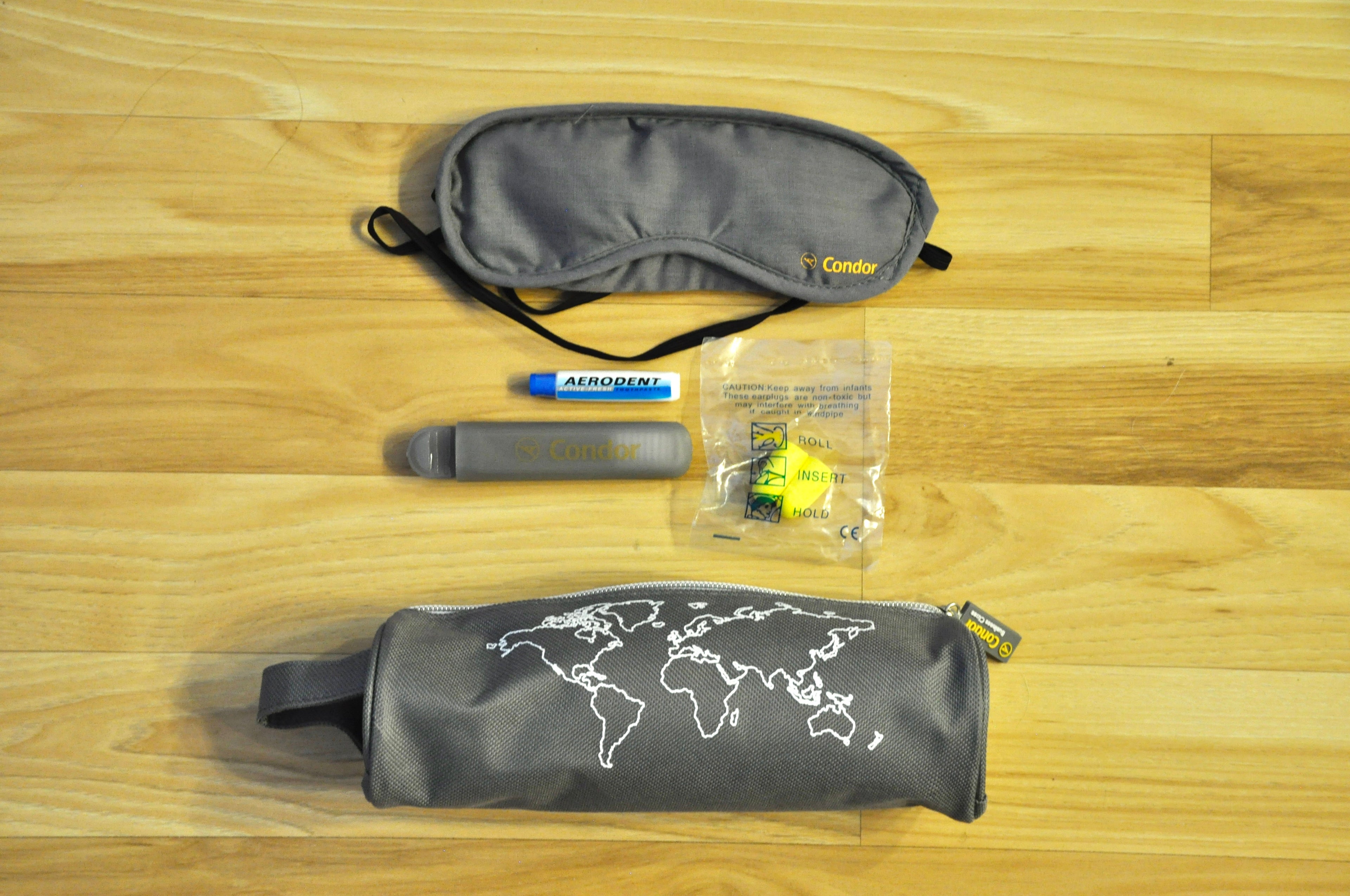 The amenity kit contained the usual offerings, including an eye mask, ear plugs, socks (not pictured) and a toothbrush with toothpaste.