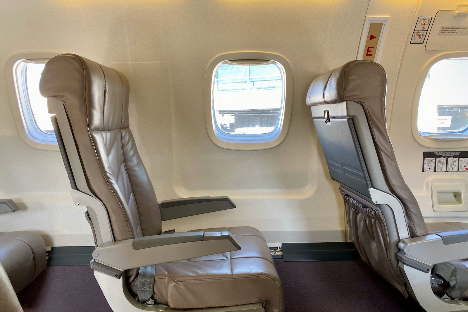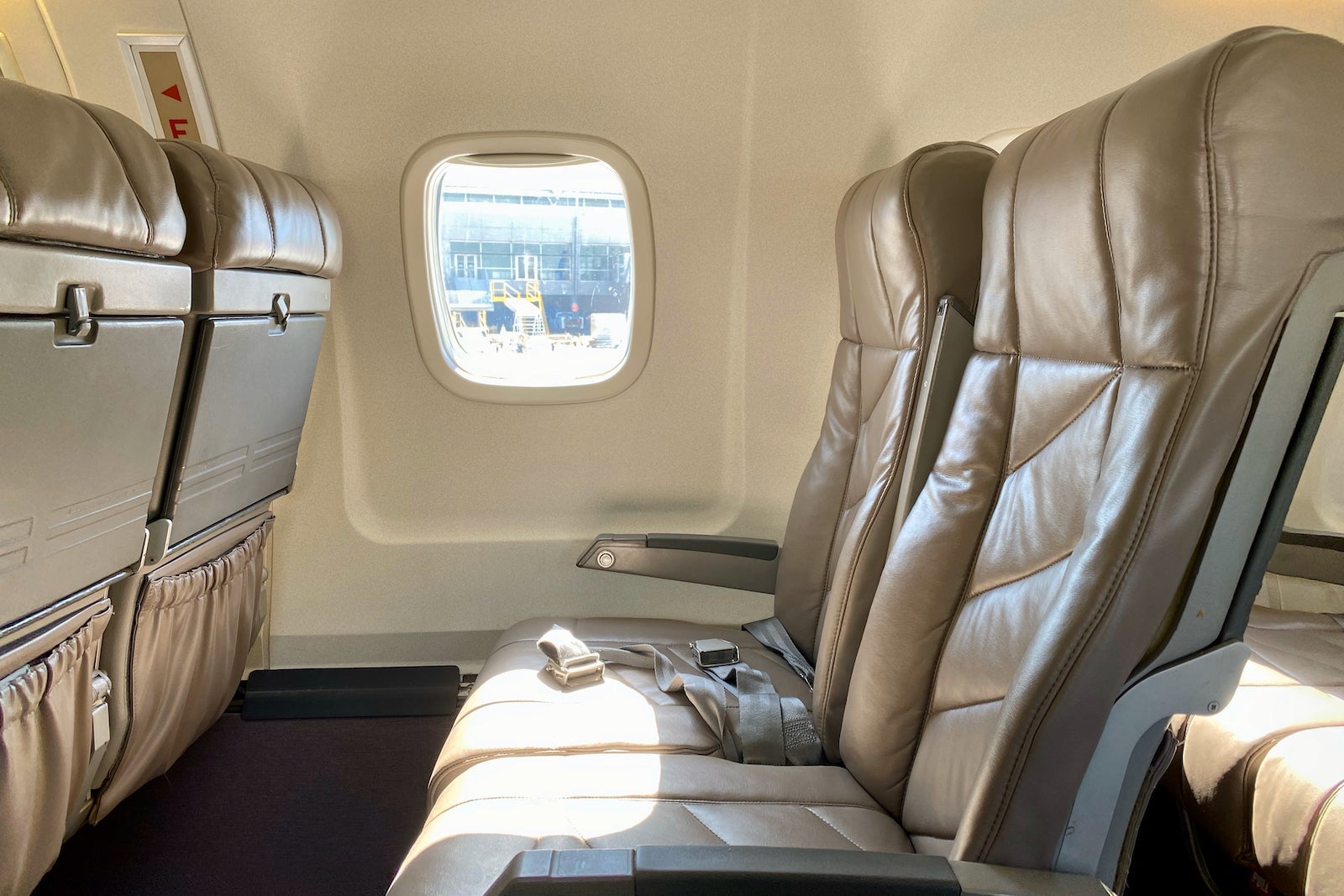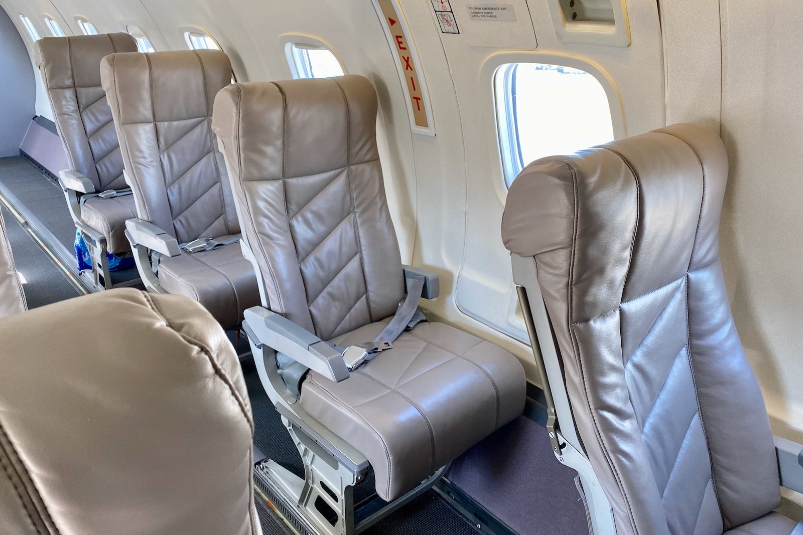 I asked the flight attendant why Contour didn't put more seats in these E145s, which are designed for up to 50. She explained that because of the weight and balance considerations and to keep capacity the same as the airline's E135s, the airline decided to keep 30 seats across its entire fleet. (JSX does the same.)
