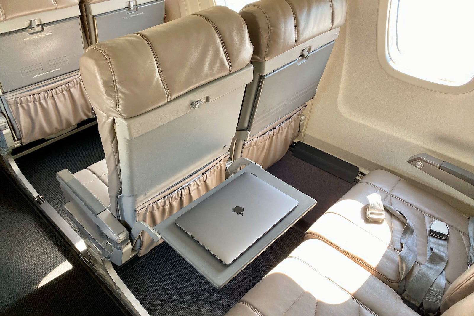 Above the seatback pocket is the tray table, which is 16 inches wide and 11 inches long. I had no trouble fitting my 13-inch MacBook Pro on this table.