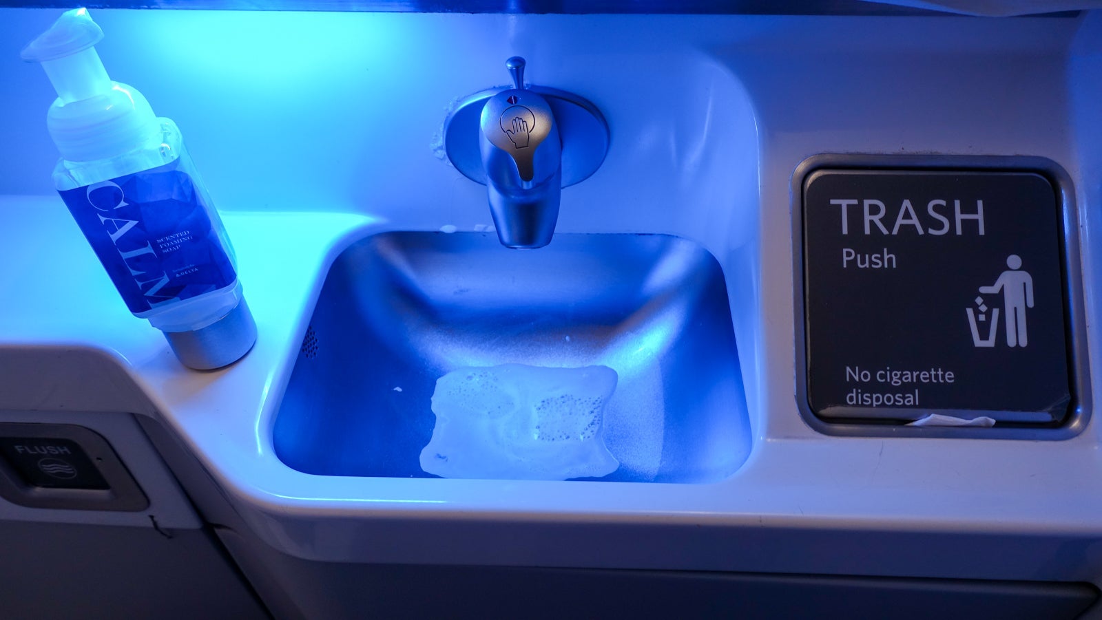 Probably because (did I mention?) there weren't many people on board, the lav stayed sparkling clean throughout the flight, and it was well-stocked with paper towels and Delta's typical "calm"-scented foaming soap. Not only did I never have to wait, but I could also choose which bathroom I used. Talk about spoiled for choice!