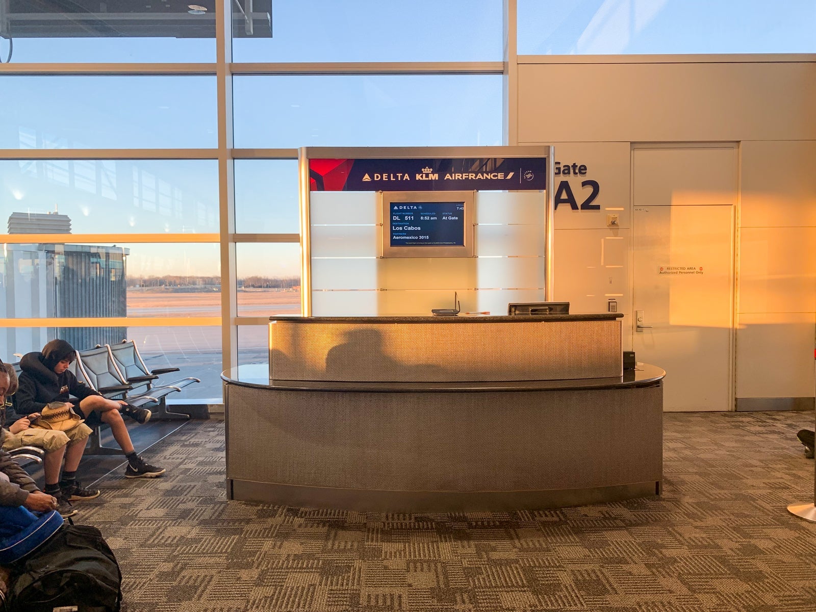 After landing at DTW, I hustled straight to Gate A2 to ask for early boarding so I could try to snap a few photos of the cabin and seat before the hordes of Cabo-bound spring breakers boarded. (See above: fear of not getting photos.)