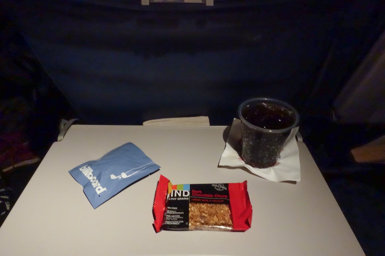 The food and beverage service was delayed by turbulence after takeoff, but ultimately flight attendants came by with complimentary soft beverages and an option of snacks: pretzels, KIND granola bars and the airline's iconic Biscoff cookies.