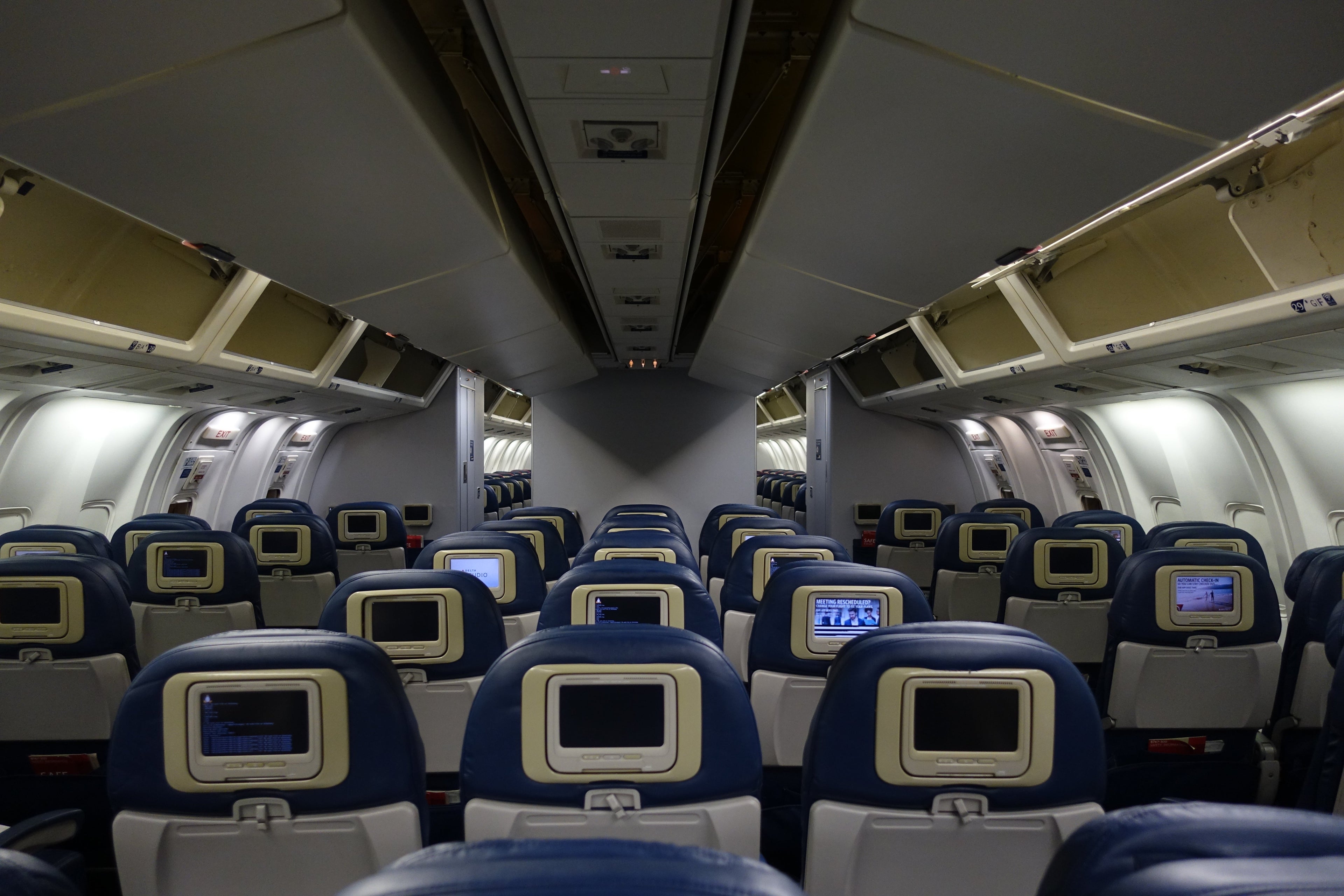 The cabin itself felt spacious, due in part to the almost coffered ceiling. But the overhead storage bins were incredibly shallow — another sign of this aircraft's age. My carry-on rollaboard had to go in horizontally, which is one of my greatest travel pet peeves.