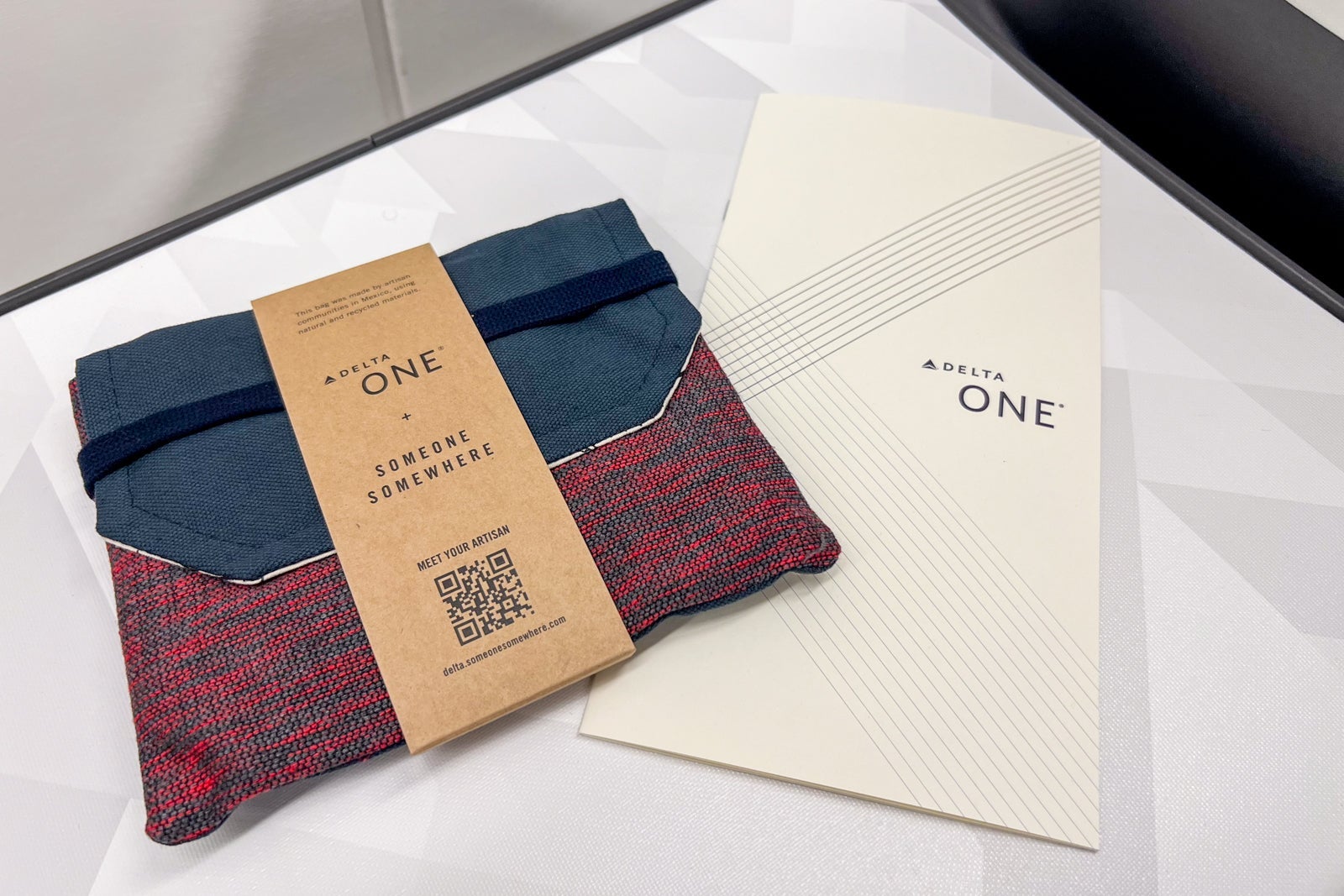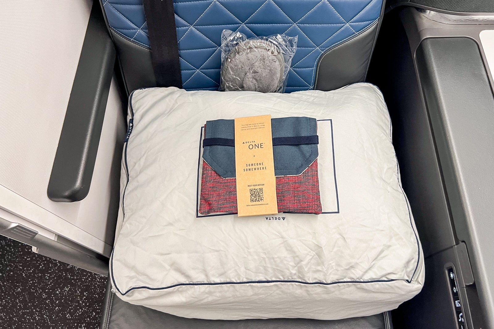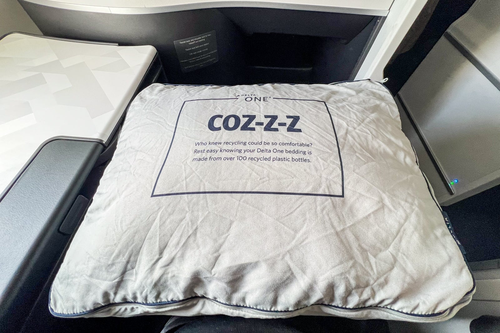 Each Delta One Suite was provisioned with CoZzz bedding, including a pillow and blanket made from recycled materials and contained within a laundered, reusable fabric pouch to avoid the need for single-use plastic. The airline shifted to this eco-friendlier bedding back in 2021.