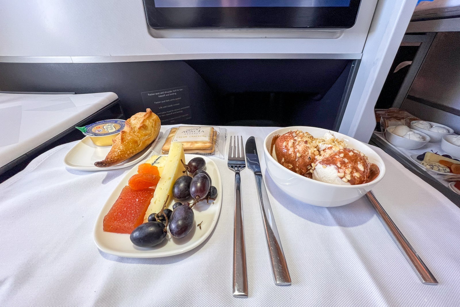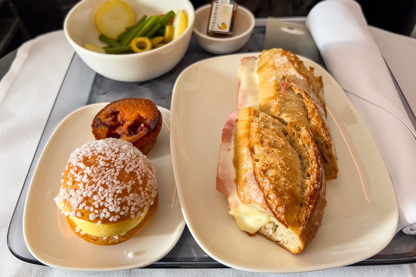 I had the sandwich, which was served piping hot and was a nice combination of salty and spicy thanks to the mustard, while the bread was crusty and filling. It was nice to have a side of green beans, potato and tomato for something fresh, and the fruit pastry and cream puff served as dessert were both surprisingly soft and fluffy. Almost as soon as I'd finished, the flight attendants were by to clear my plate, and I appreciated the speedy service.