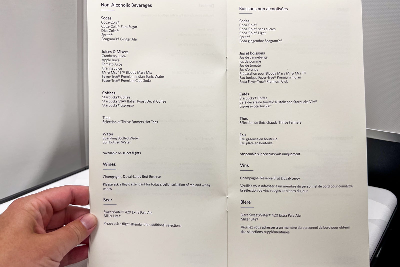 The beers aboard included Miller Lite and SweetWater 420 Extra Pale Ale, while the spirits included options like Buffalo Trace Distillery Bourbon Cream, Bacardi rum, Bombay Sapphire gin, Grey Goose vodka and several different whiskeys.