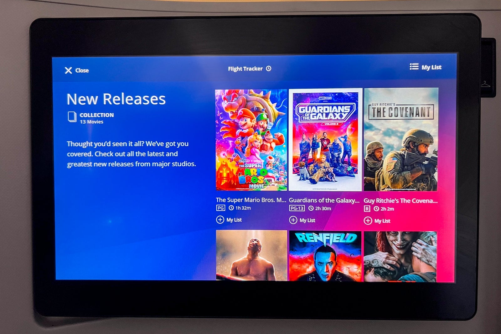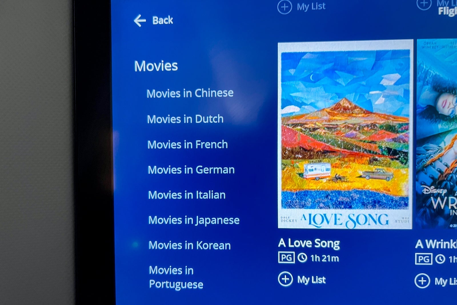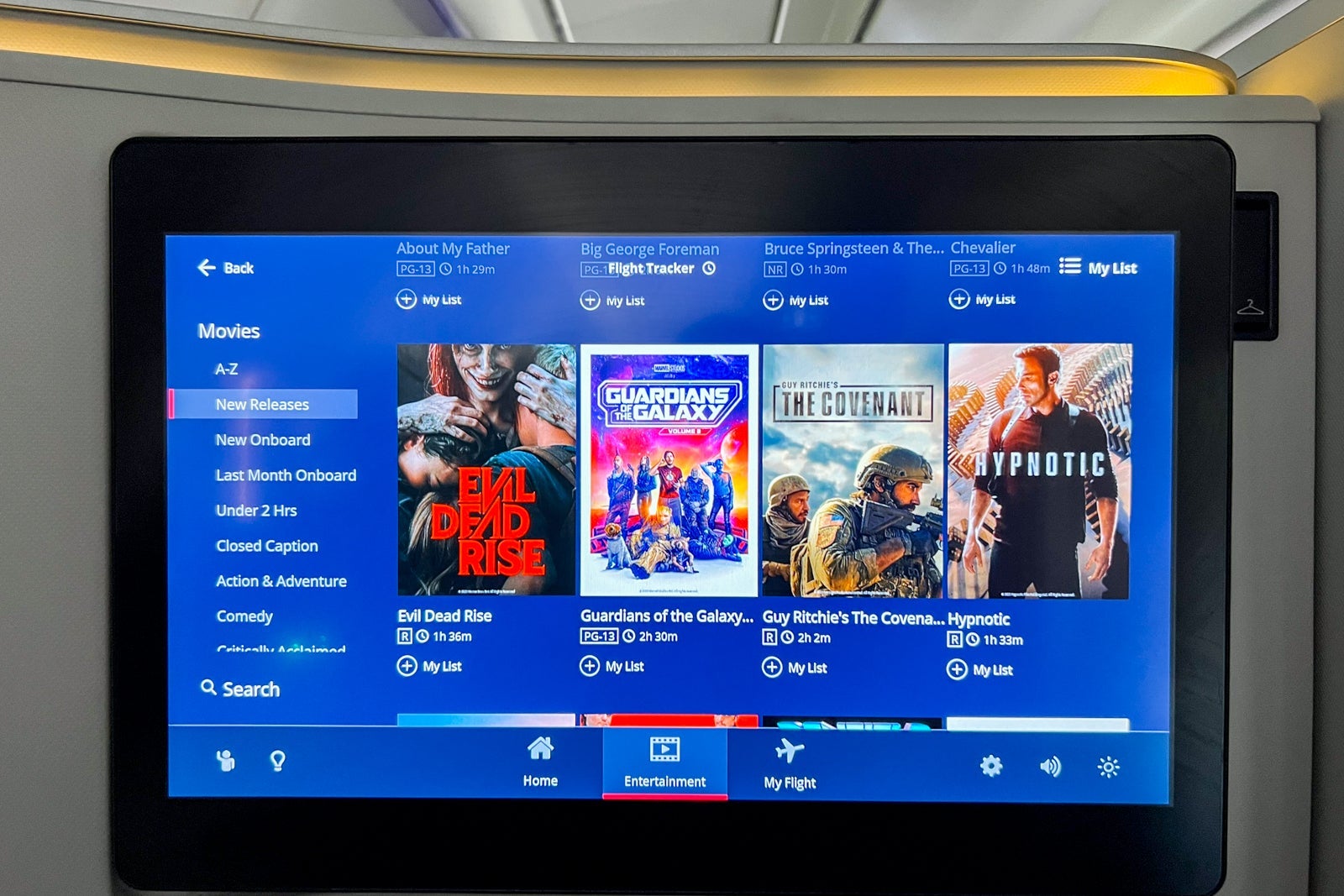Speaking of the entertainment system, the slim-profile touchscreens are 18 1/2 inches across diagonally and crystal-crisp. According to the system, there were 536 movies, 83 television series and 140 audio selections on offer.
