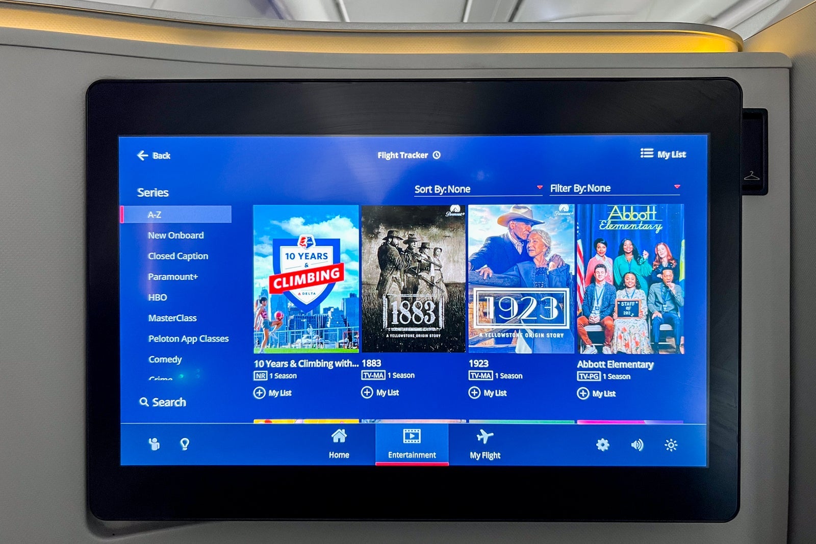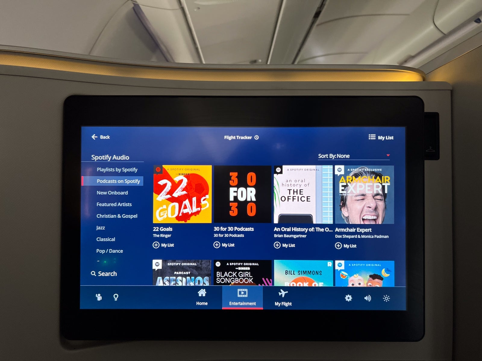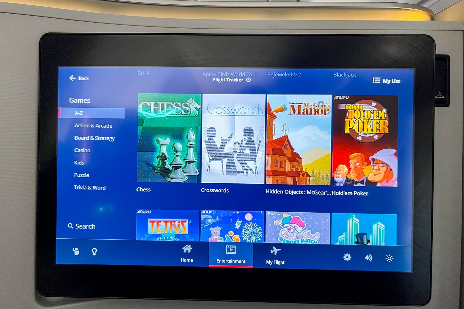 Speaking of the entertainment system, the slim-profile touchscreens are 18 1/2 inches across diagonally and crystal-crisp. According to the system, there were 536 movies, 83 television series and 140 audio selections on offer.