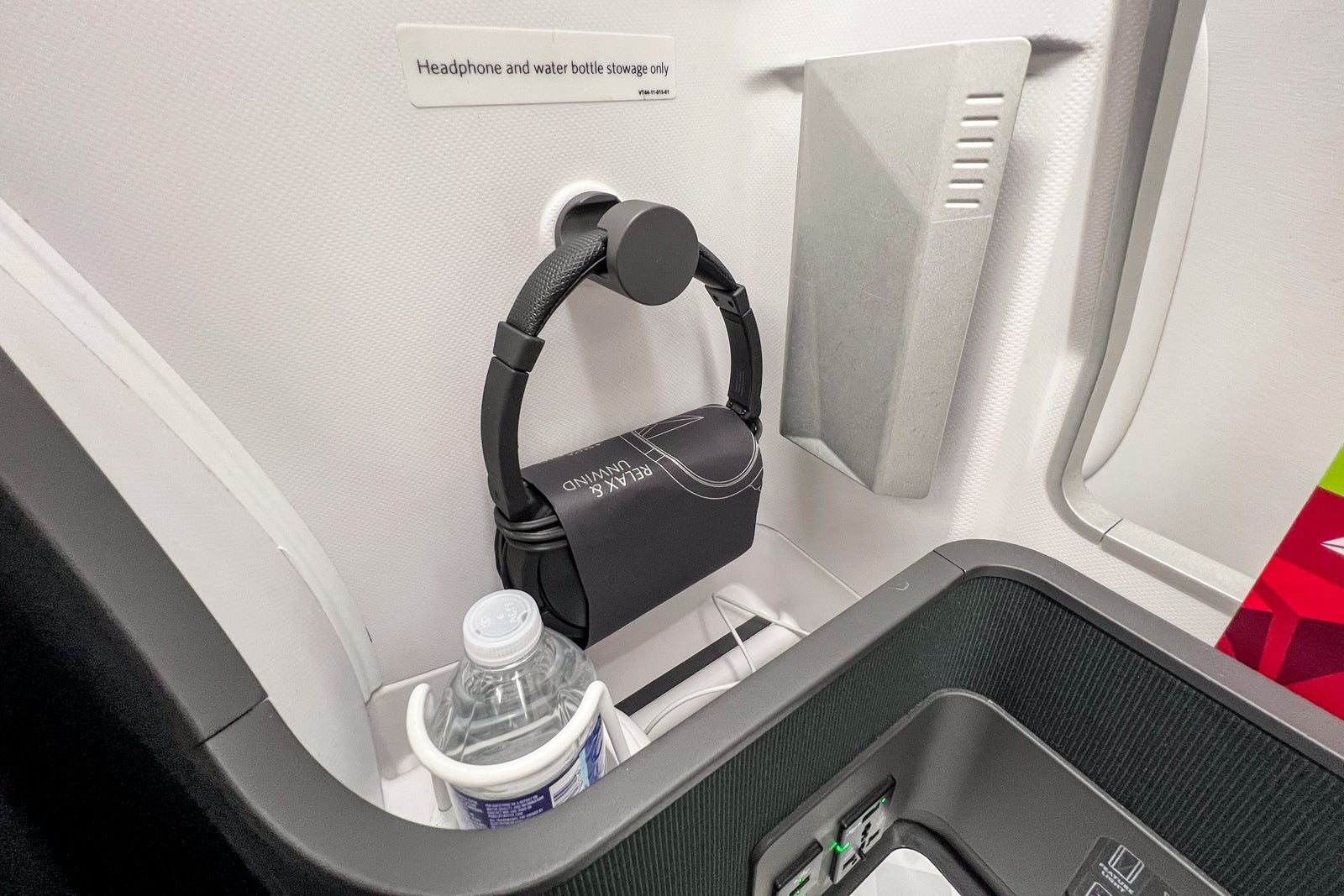 Beside the seatback was an open cubby with a hook for headphones, a water bottle holder and a little space for small personal items like a cellphone or glasses case.