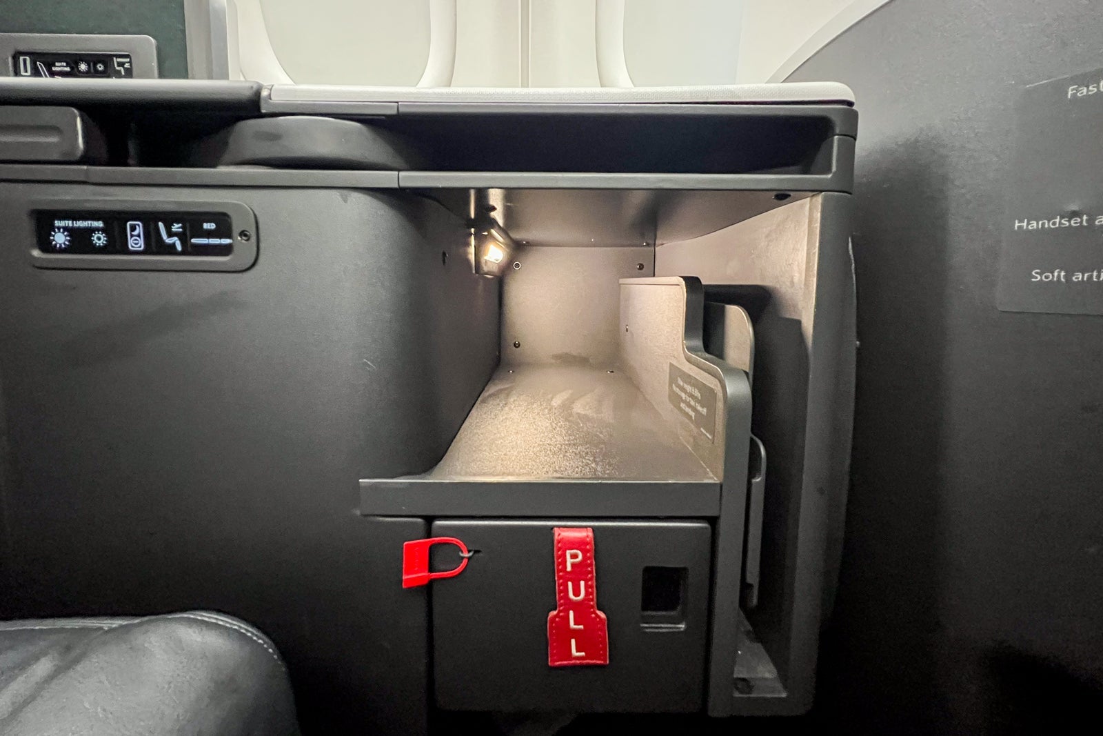 Although there was not a good place to stow a computer or large device for takeoff and landing, the seat did have a few convenient storage areas. There was a deep, narrow, rectangular cubby in the large armrest where you could put an amenity kit or other personal belongings.