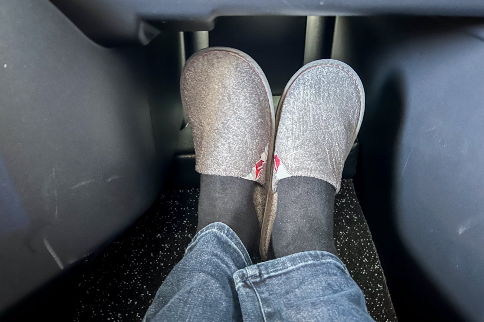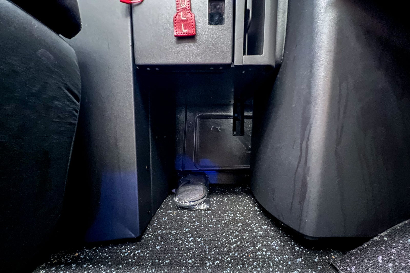 Below that was a floor cubby where you could stow your shoes if you wanted to don the slippers provided by the airline instead.