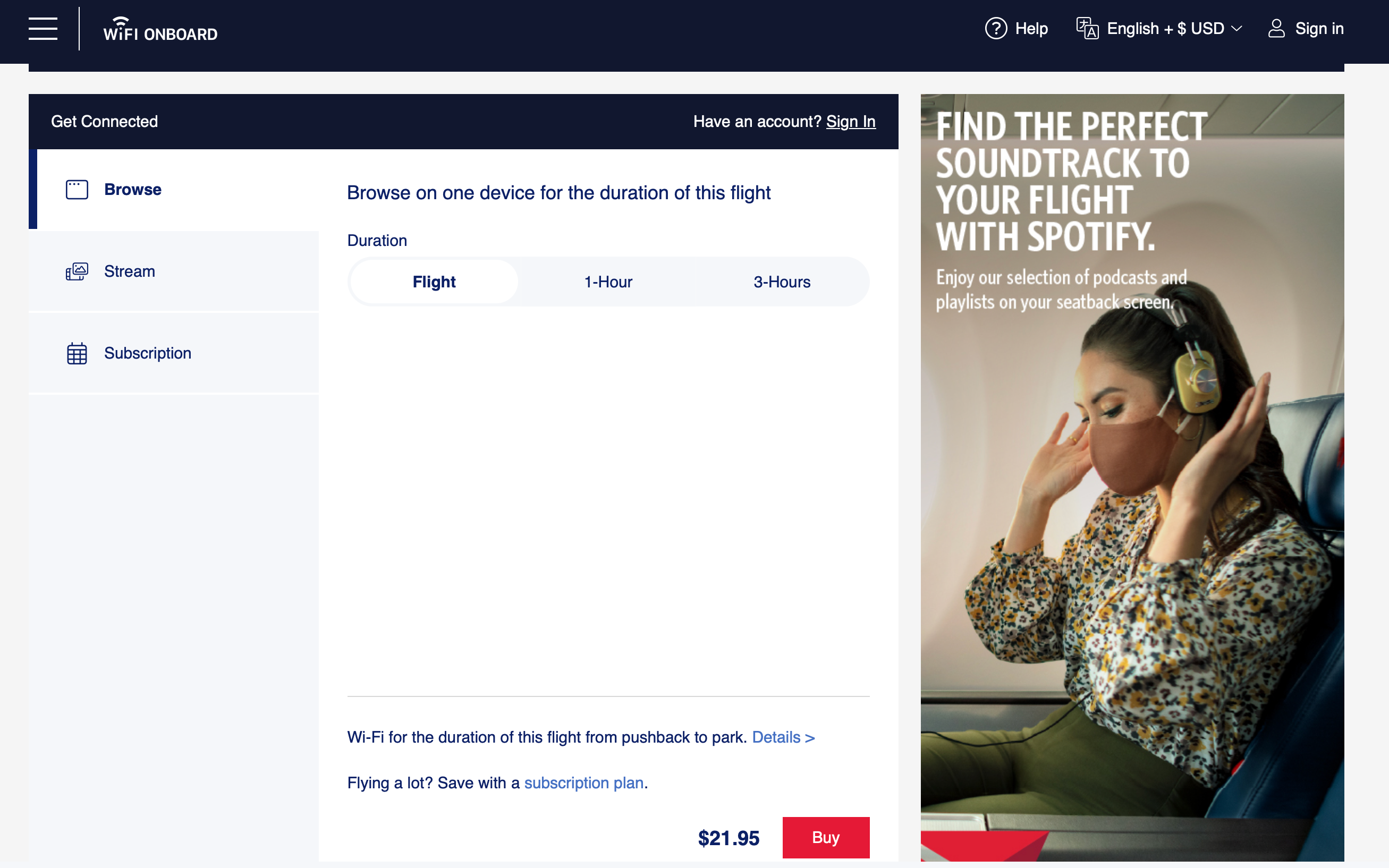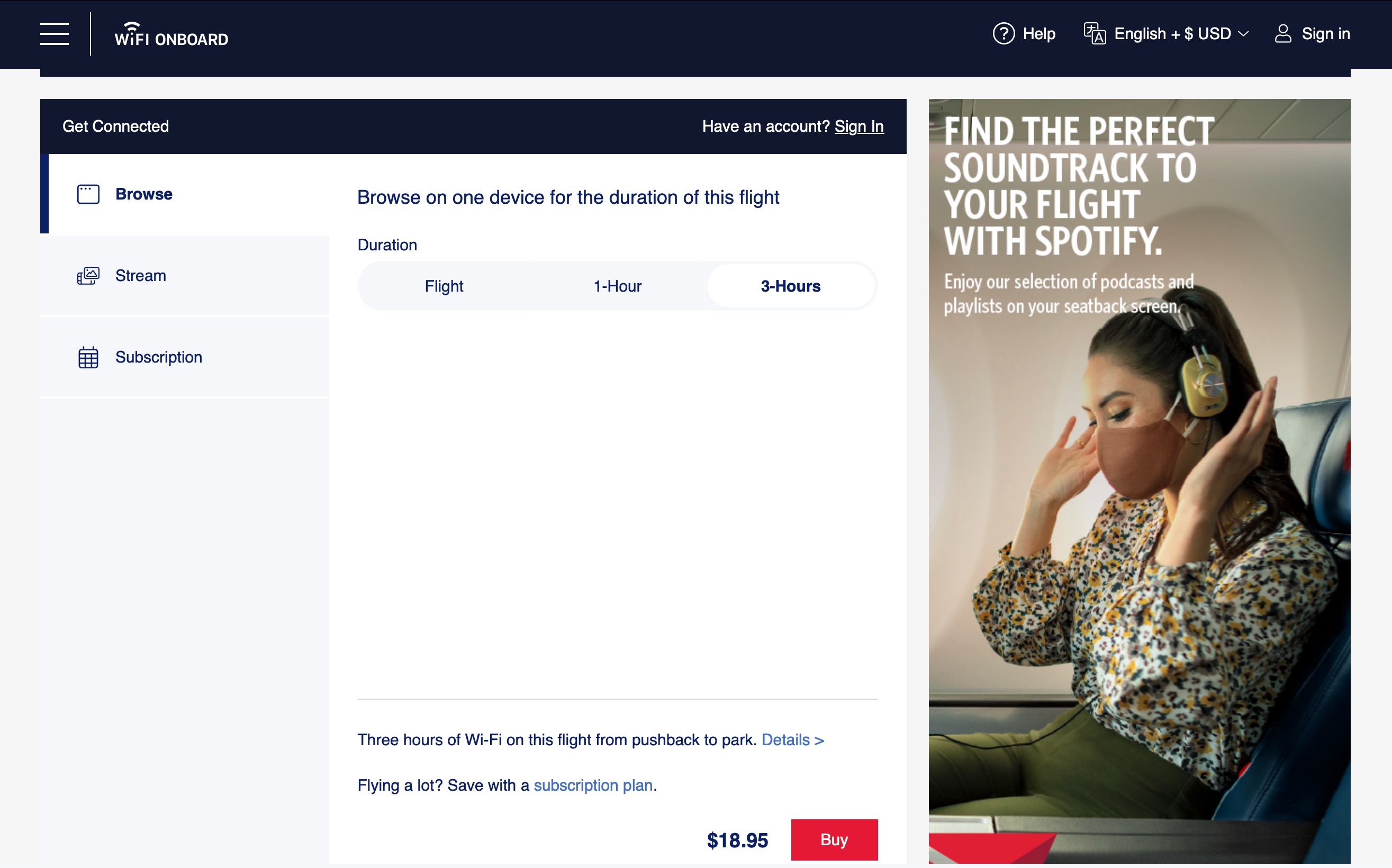 I logged on to the plane's Wi-Fi after we hit cruising altitude and was able to choose from three packages: