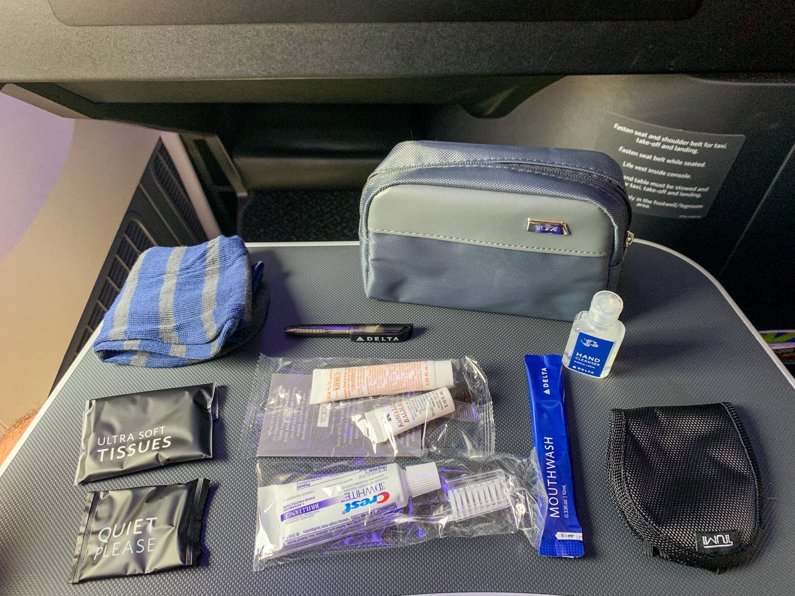 Delta was still in the process of rolling out its upgraded amenity kits across its hubs when I flew this flight, so I didn't have the latest one. But I still got a lot of goodies, including a pair of socks, tissues, earplugs, a pen, Kiehl's lip balm and lotion, a dental kit, hand sanitizer and one of those great Tumi eye masks.