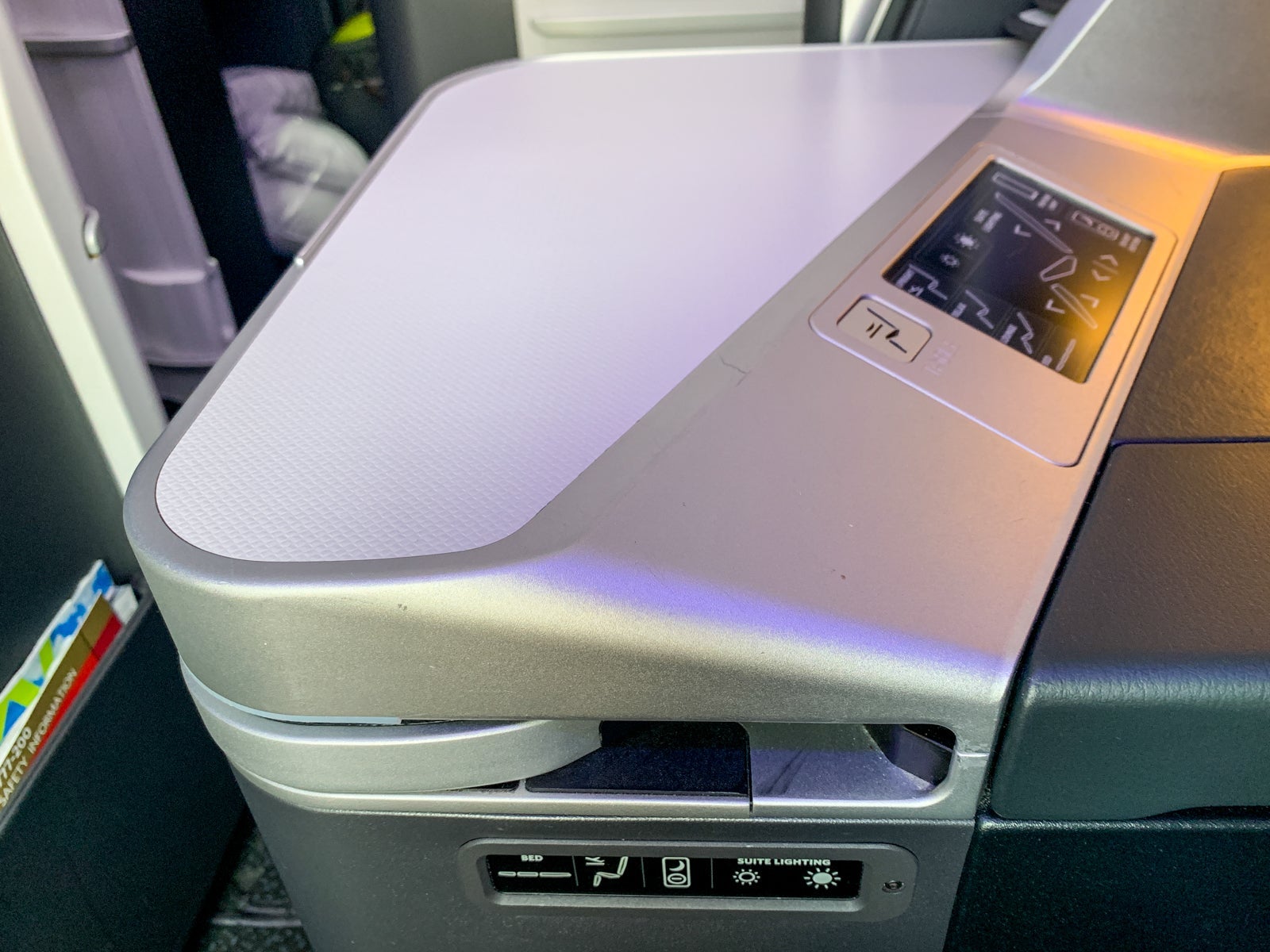 To the right of the seat was a sconce light that slid open to reveal a reading light. Also in this area were the seat's main storage areas, which consisted of a cubby, a large table and a raised shelf. I stored most of what I needed to keep with me in the cubby, but put my laptop under the shelf when I wasn't using it.