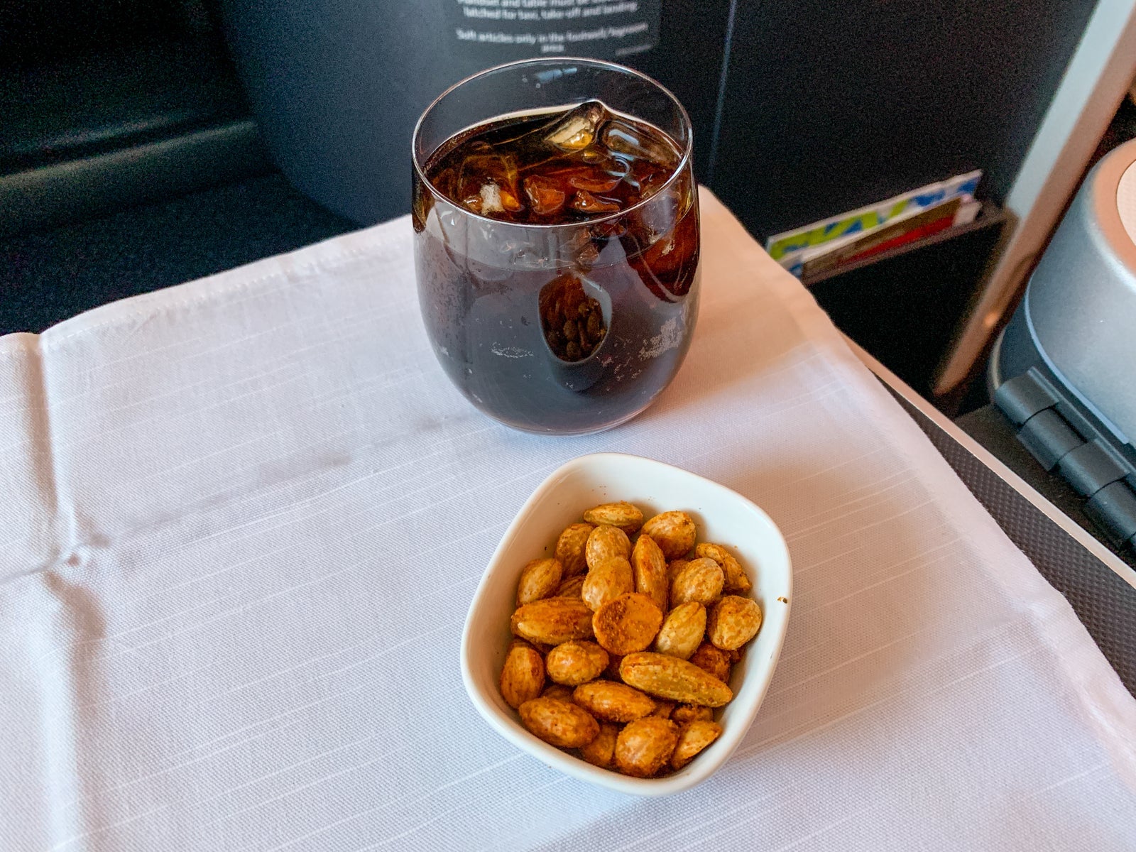 Just about 20 minutes after takeoff, the crew began the meal service. I was given a ramekin of warm salted almonds and asked for a Diet Coke to go along with it.