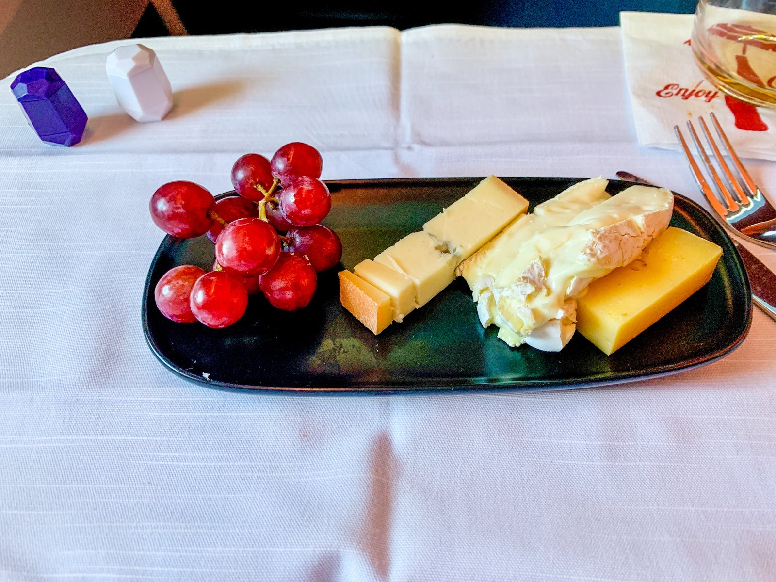 For dessert, there was a choice: ice cream sundaes, chocolate cake or a fruit-and-cheese plate. I went with the cheese, which was on the smaller side, but I still enjoyed it as I was finishing up my movie.