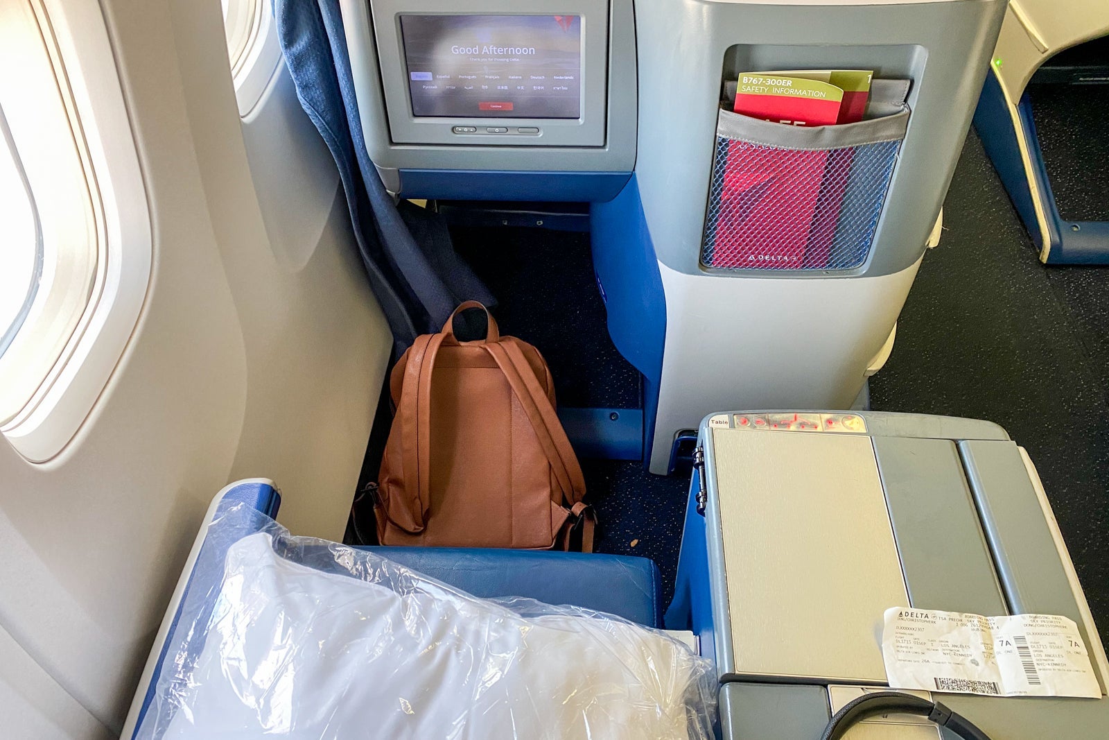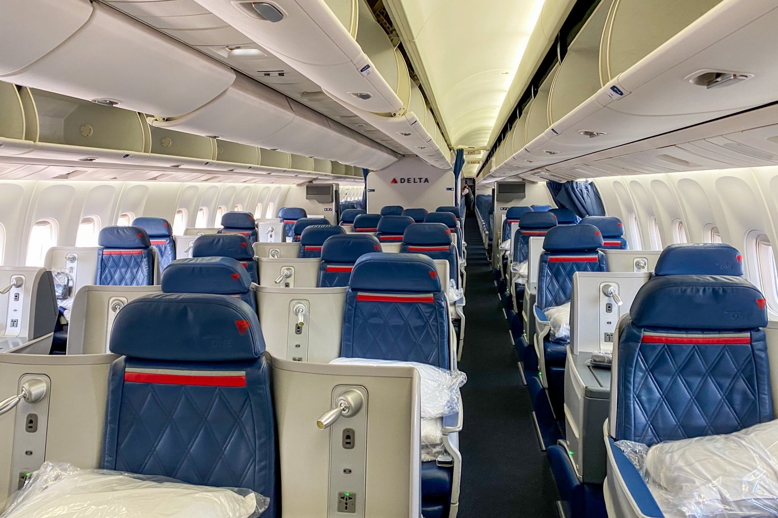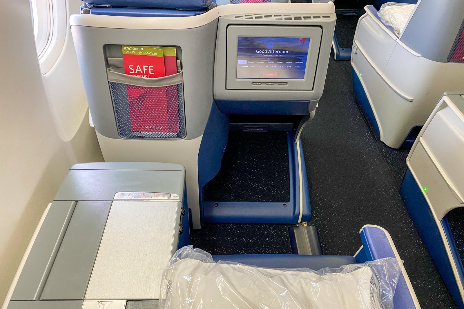 767s are fantastic for the passenger experience in economy with easier aisle access in a 2-3-2 cabin configuration. Up front in Delta One, however, these are lie-flat seats that definitely show their age.