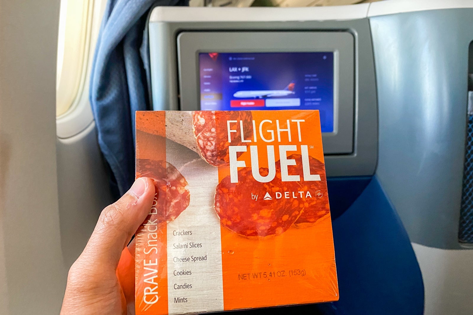 Delta One passengers also get their pick of a Flight Fuel snack box, either a "Crave Box" or "Tapas Box." I chose the option that had a protein, although the snacks were all definitely a sodium bomb.