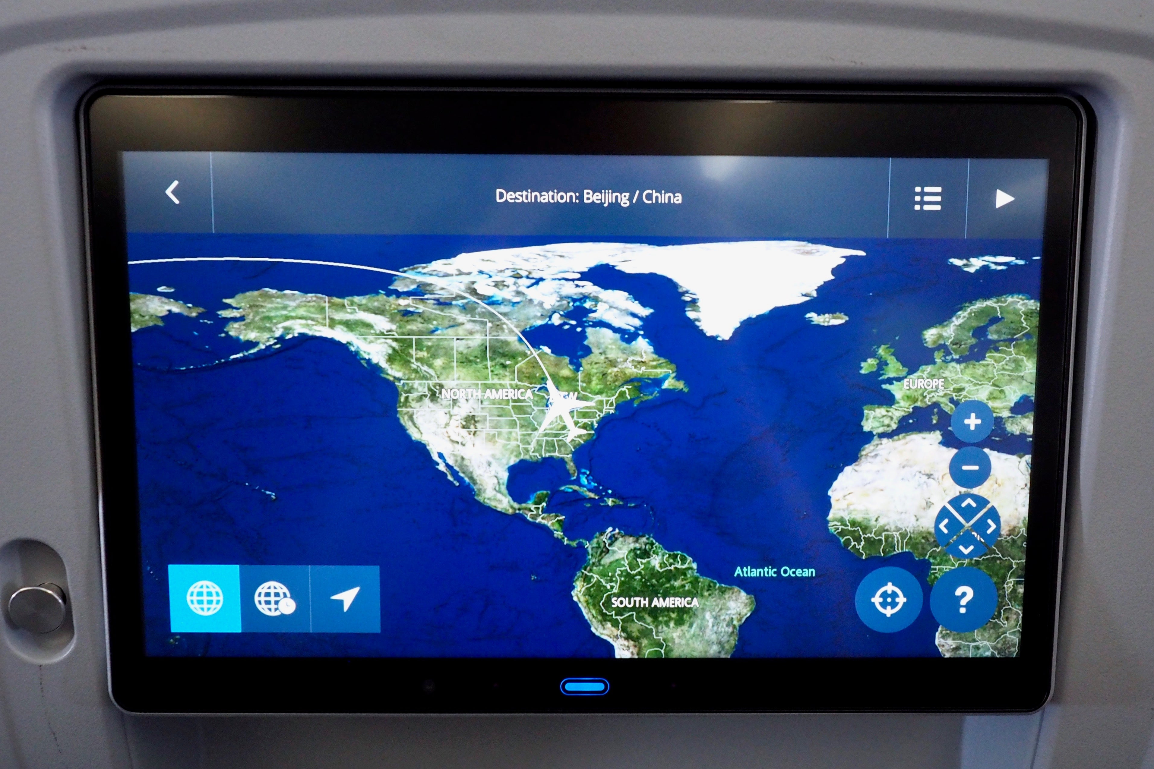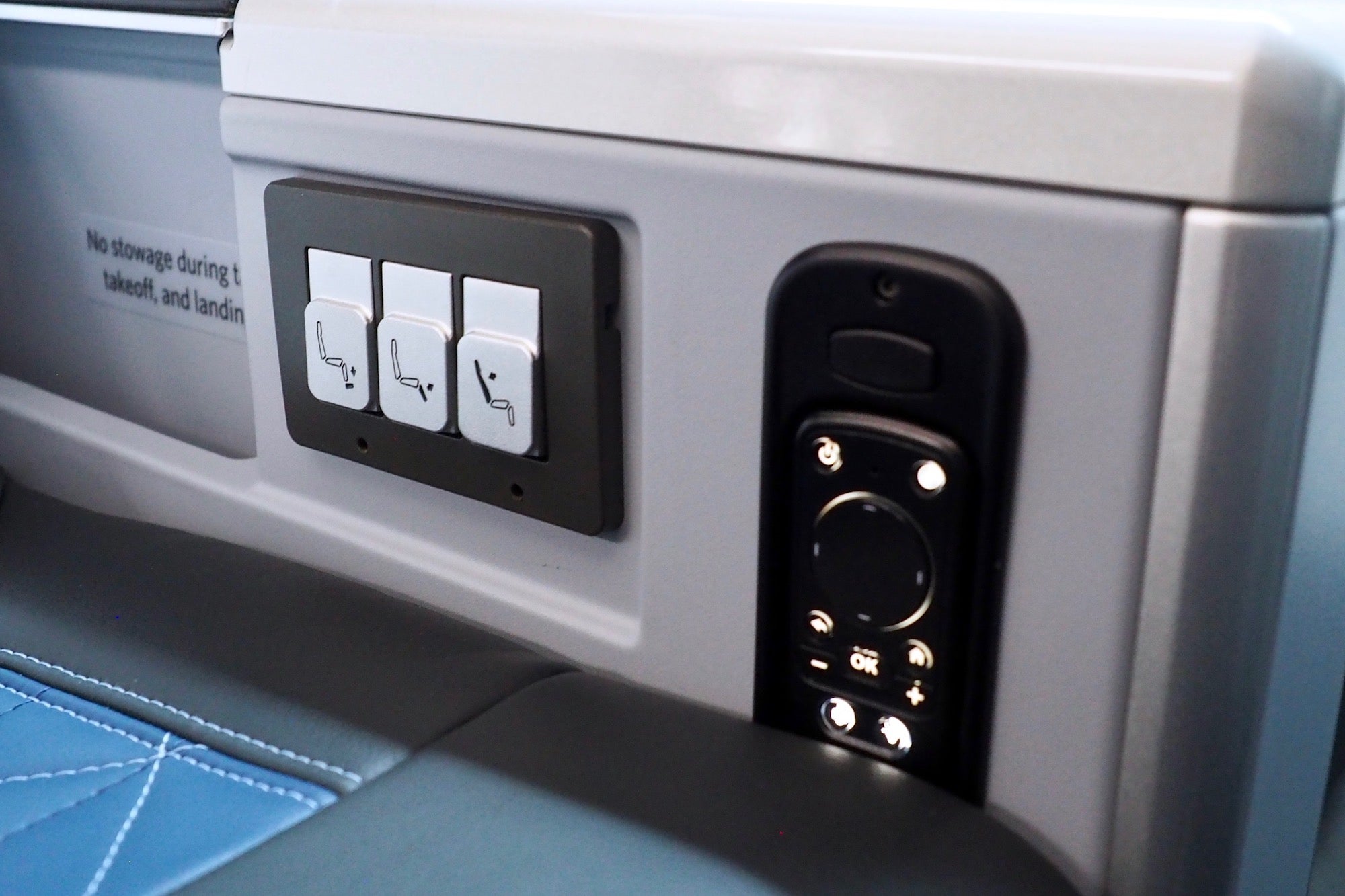 A remote control is tucked into the side of the armrest, but the seat's thick cushion made it extremely difficult to actually pull it out. Fortunately, the touchscreen was responsive enough that I didn't actually need it. Each seat also had its own universal power outlet and USB port beneath the seat in front.