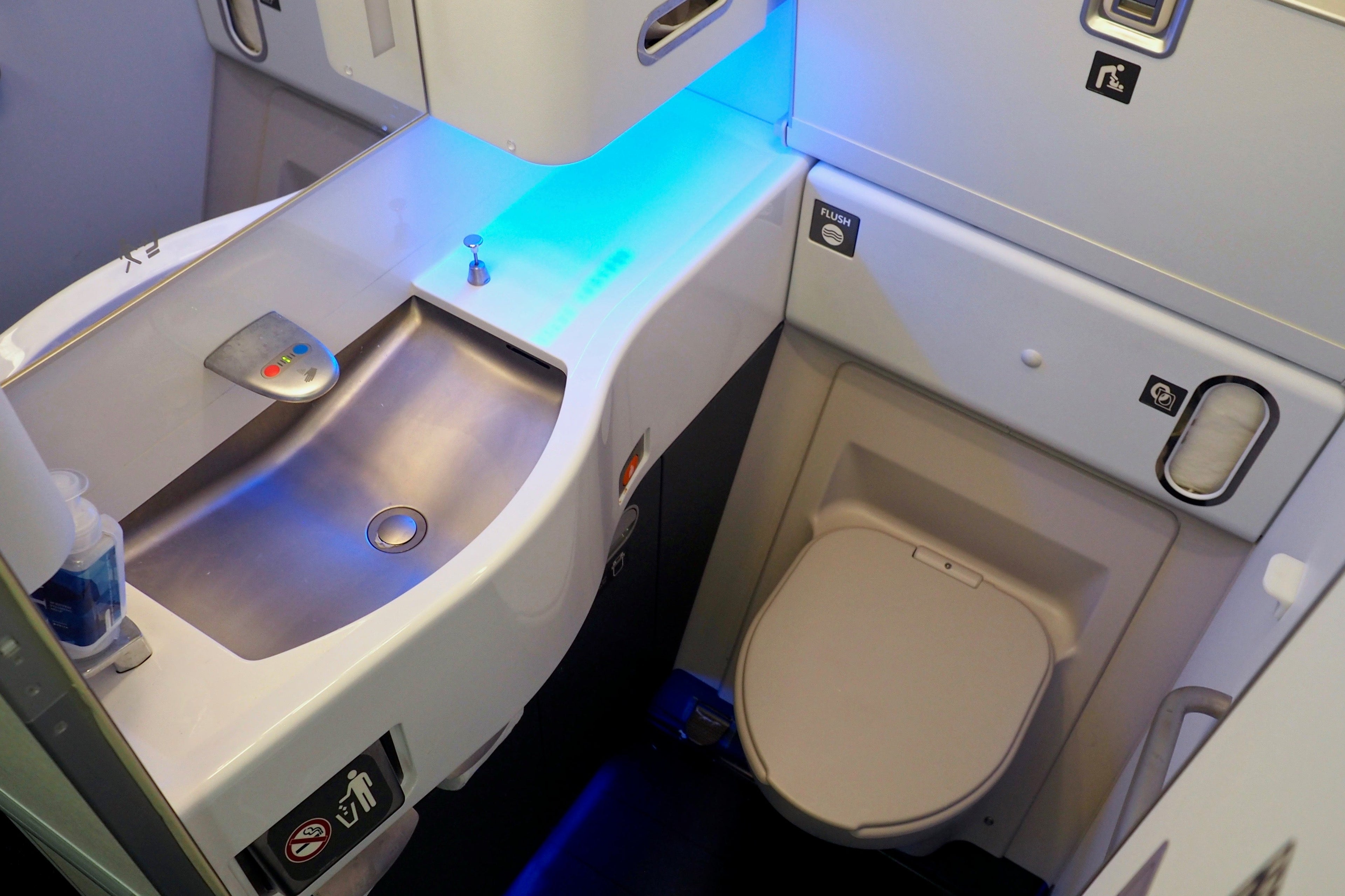 There are two lavatories at the front of the Premium Select cabin, which main cabin passengers could use as well. The only thing that set these apart was that they were stocked with Malin+Goetz body lotion.