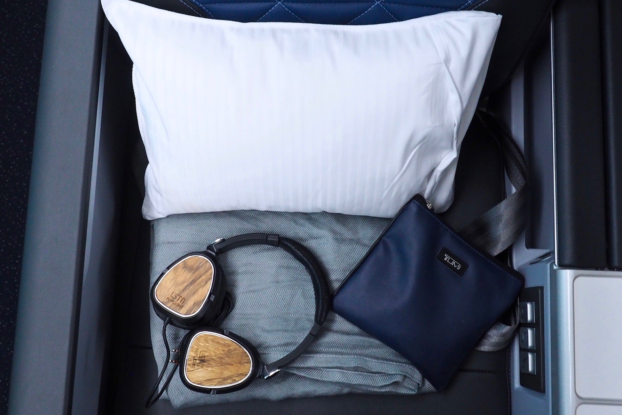 Waiting at each seat was a fluffy lumbar pillow, a Westin Heavenly-branded blanket, a set of LSTN noise-canceling headphones (the same ones found in Delta One) and a Tumi amenity kit. Usually there would also be a pair of slippers, but catering forgot to stock those for our flight.