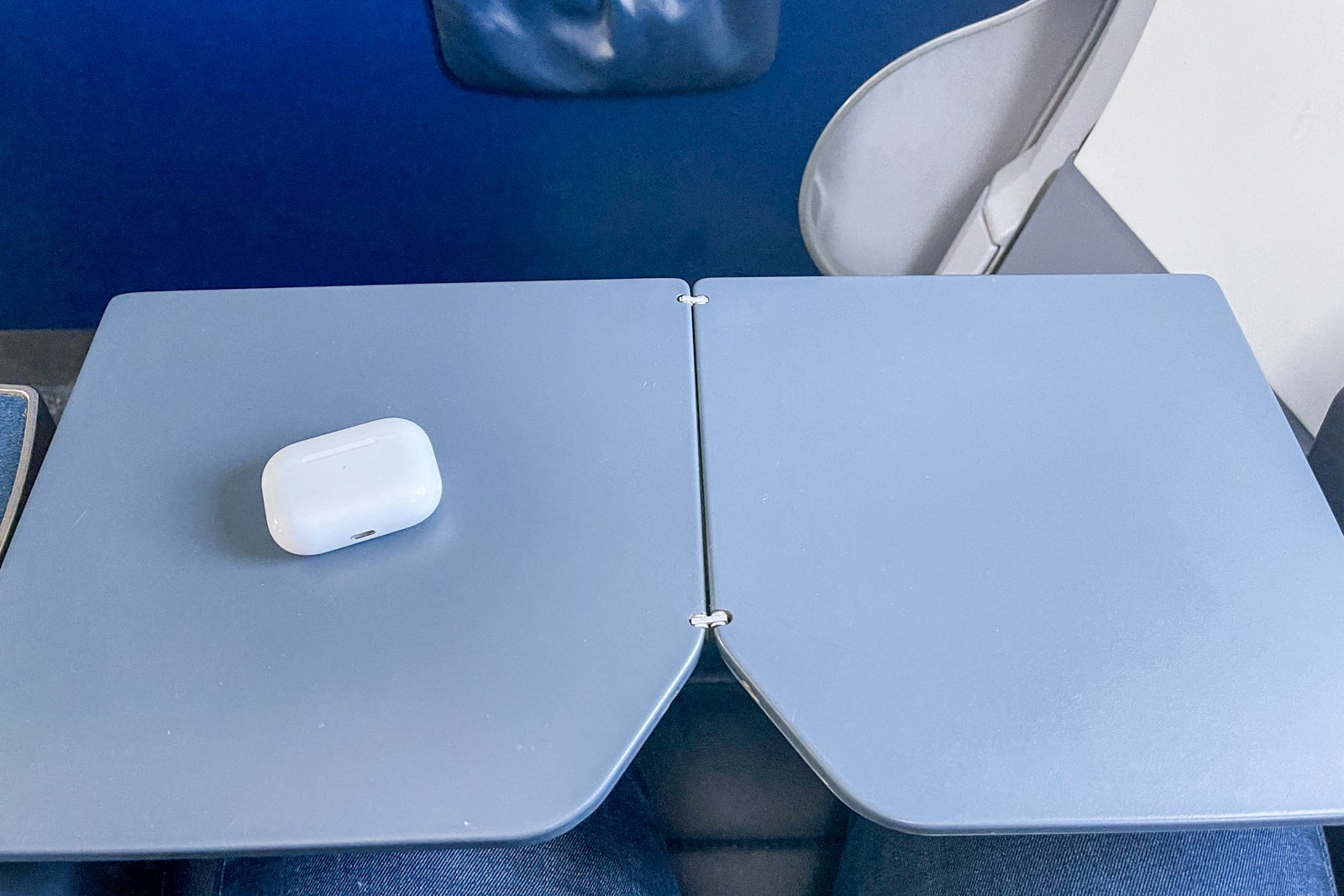 The economy seat doesn't have a full tray table and the backseat pocket is a net. This makes it difficult to get any work done on the plane as your laptop pretty much needs to stay in your lap. The tray table is simply a place to put your food or drink if you choose to buy anything on board.