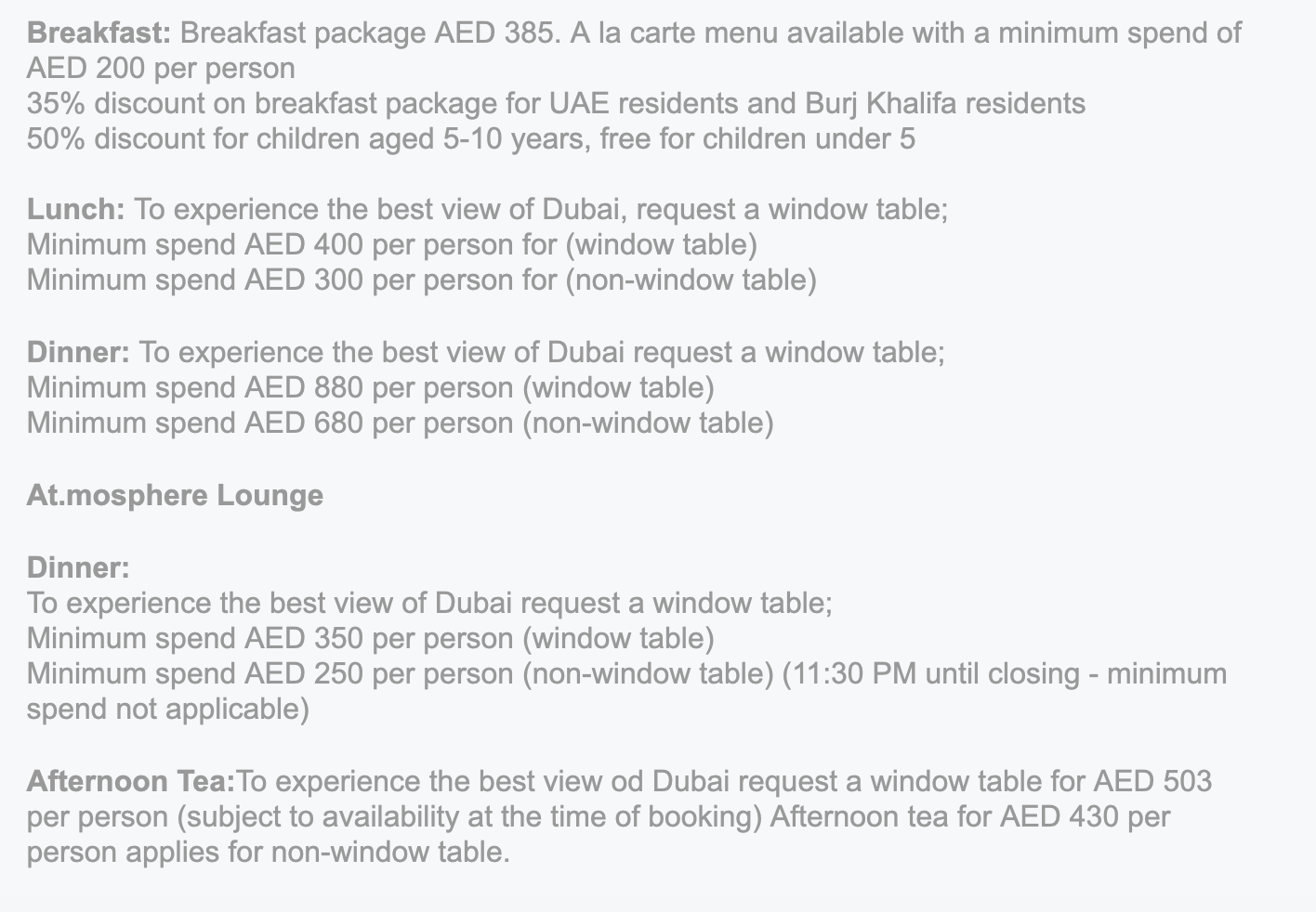 I made a reservation directly on the At.mosphere website. Depending on what meal you planned to go for, and whether you wanted to sit at a window seat or not, there were different minimum spending requirements per person.