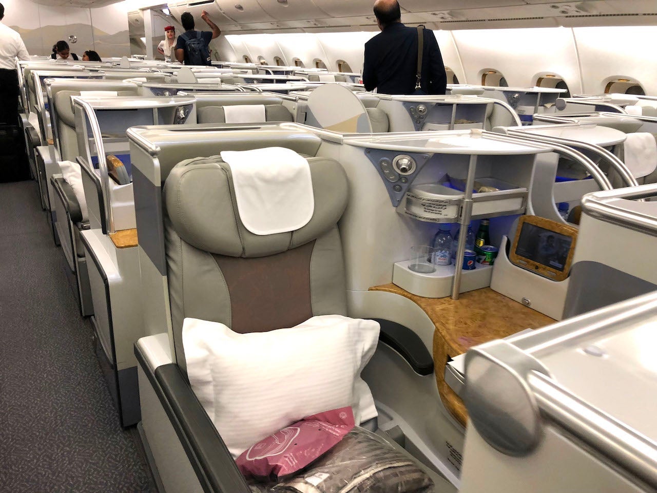 After making my way through the jet bridge to the upper deck of the enormous A380, I was greeted by a friendly Emirates flight attendant who welcomed me back to Emirates business class. Having flown the product on the A380 only once before in 2016, I found it a nice touch that the airline recognized me for returning to the cabin.