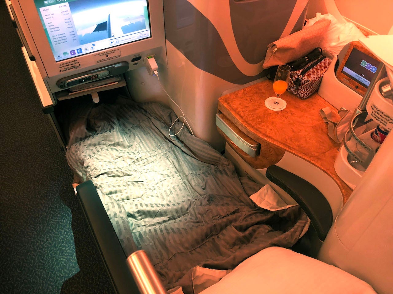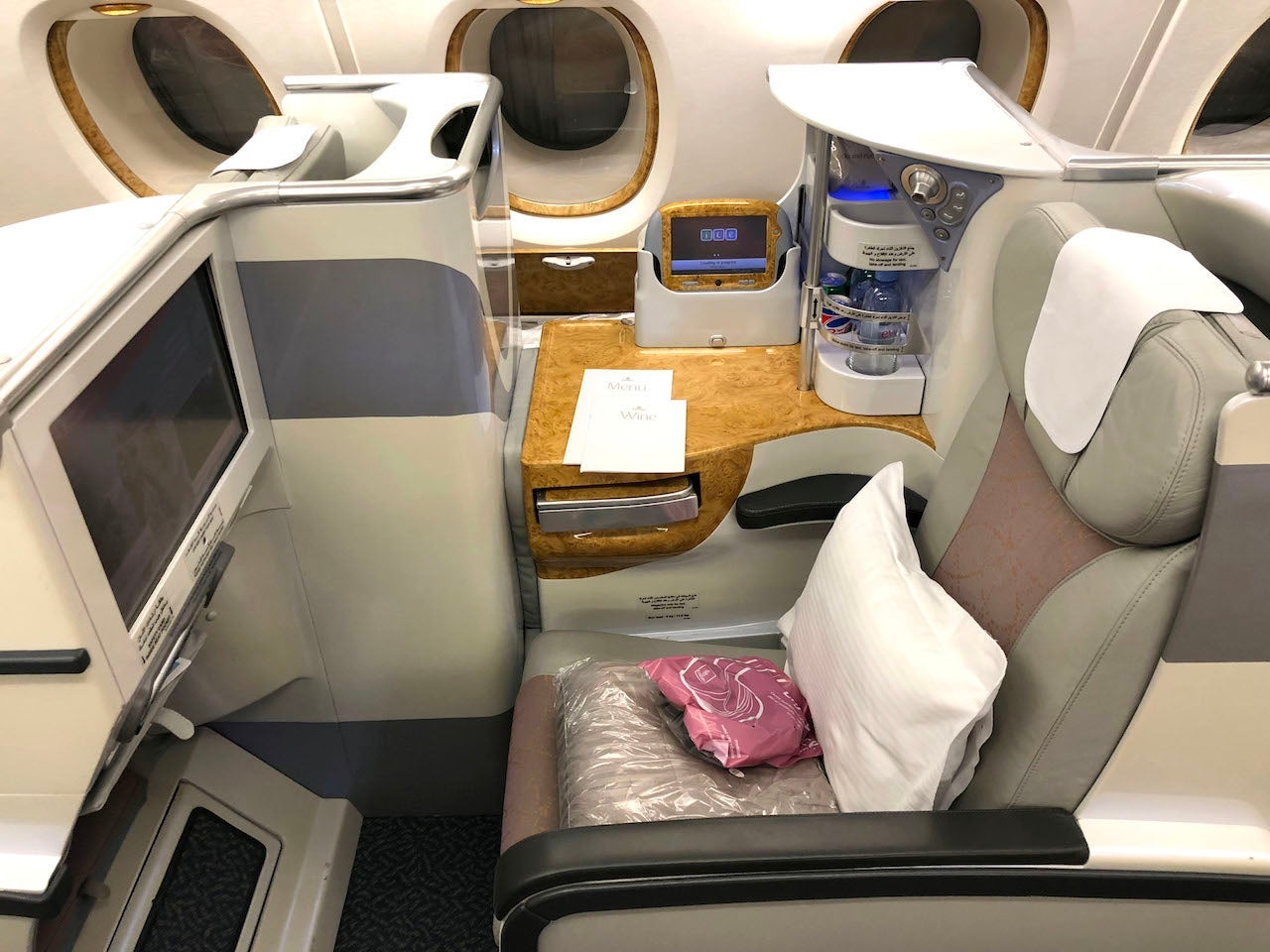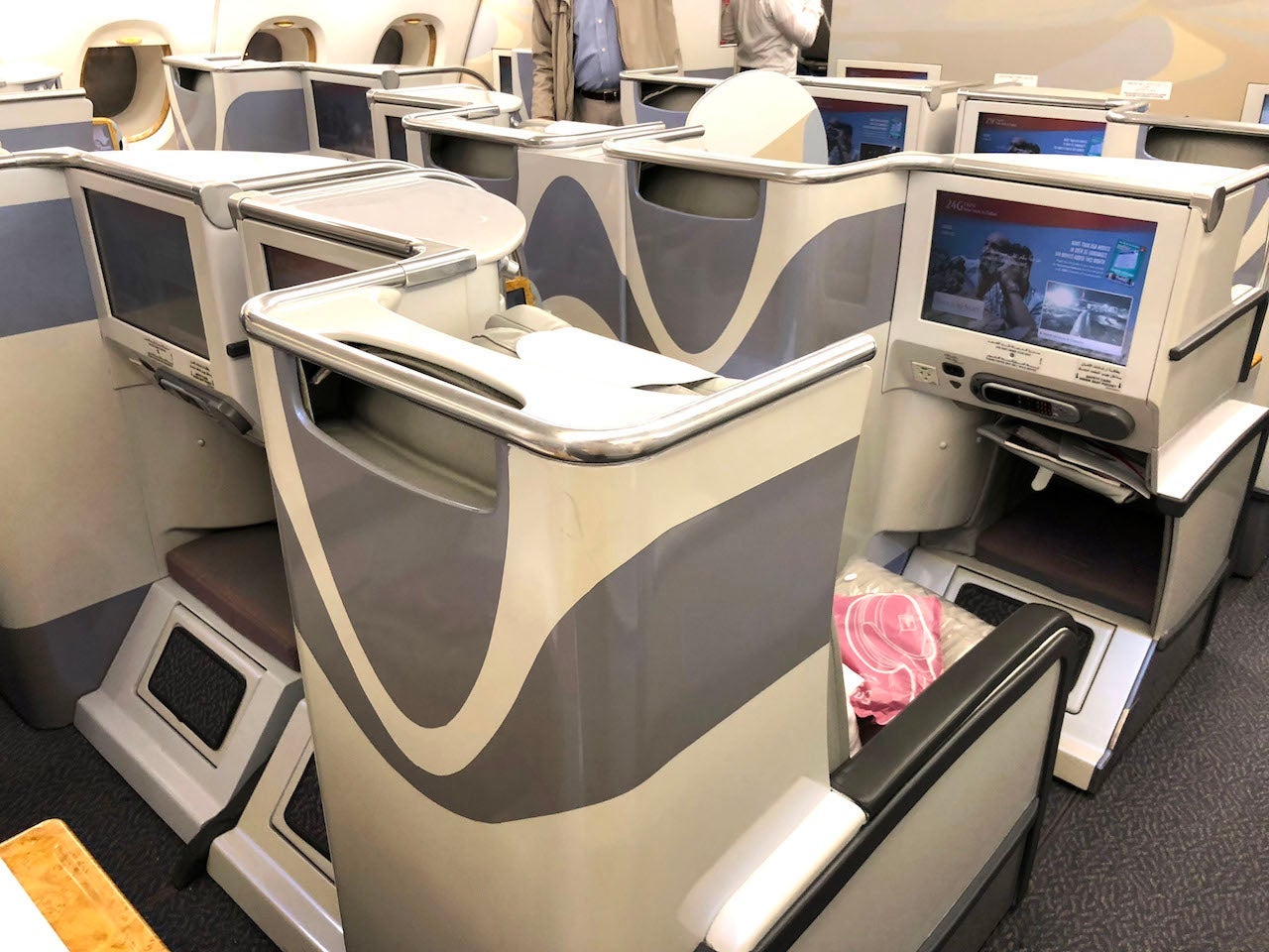 On this particular A380, the upper deck is comprised of 14 closed first-class suites arranged in a 1-2-1 configuration, which I later tried on a new version of the aircraft on the world's shortest A380 flight from Dubai (DXB) to Muscat (MCT). Behind the first-class cabin, you'll find 76 lie-flat seats, also arranged in a 1-2-1 configuration. Each of the seats has 48 inches of pitch and is 18.5 inches wide, which seems narrow on paper, but I actually found it to be spacious enough since there was room to stretch out and I could place my belongings on the generously sized side table.