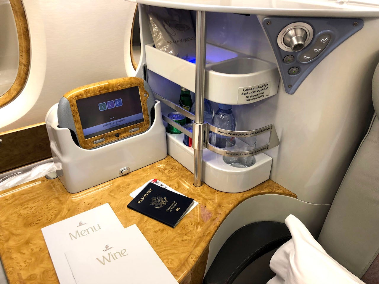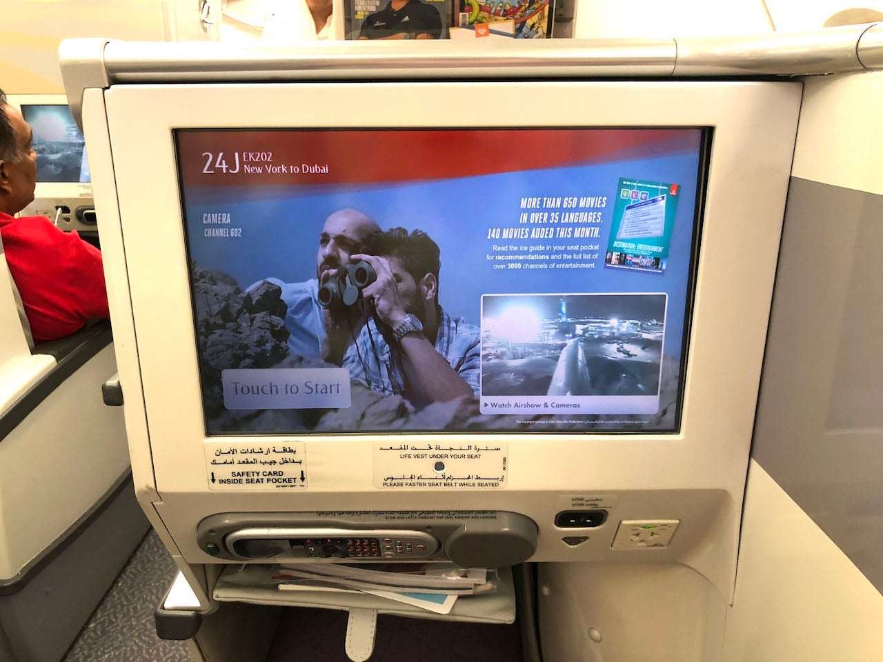 Aside from the premium bar, which is available to travelers in business and first class, Emirates offers several other notable amenities. Business-class passengers have access to a loaded in-flight entertainment system, complete with a 23-inch touchscreen. The screen itself is huge and can be controlled three ways — via the touchscreen, a small handset in the armrest or via a small tablet, which is also capable of displaying content of its own. I found myself using the small side tablet to display my flight info, and I watched movies on the main screen. ("Ladybird" was offered on the flight. If you've never seen it, I highly recommend!) Options included newly released films and TV shows, as well as some great exterior camera shots of the aircraft, perfect for AvGeeks.