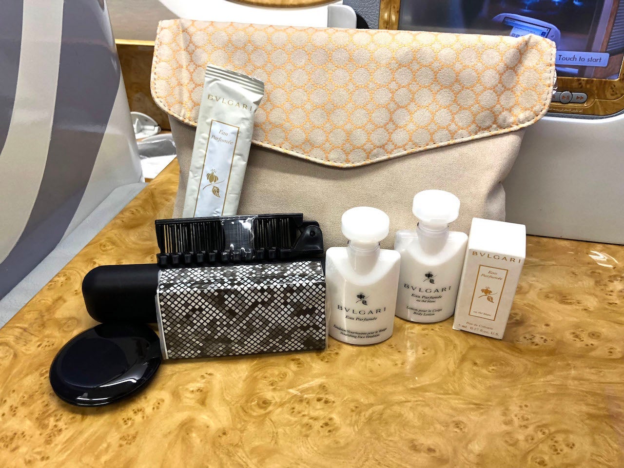 At boarding, flight attendants distributed amenity kits for business-class passengers — women and men received different kits. Inside my kit was a brush, tissues, mirror, a set of lotions and perfume from Bulgari and a dental kit. I liked the bag itself, and kept it to reuse.