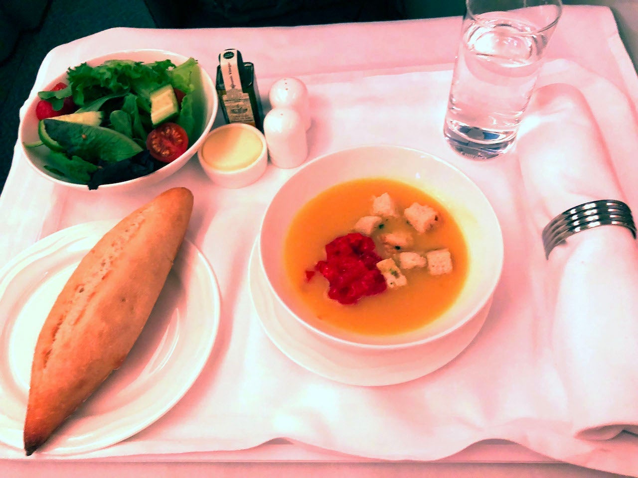 I opted for the lemongrass soup, which was light and tasty, though not the best in-flight soup I've been served.