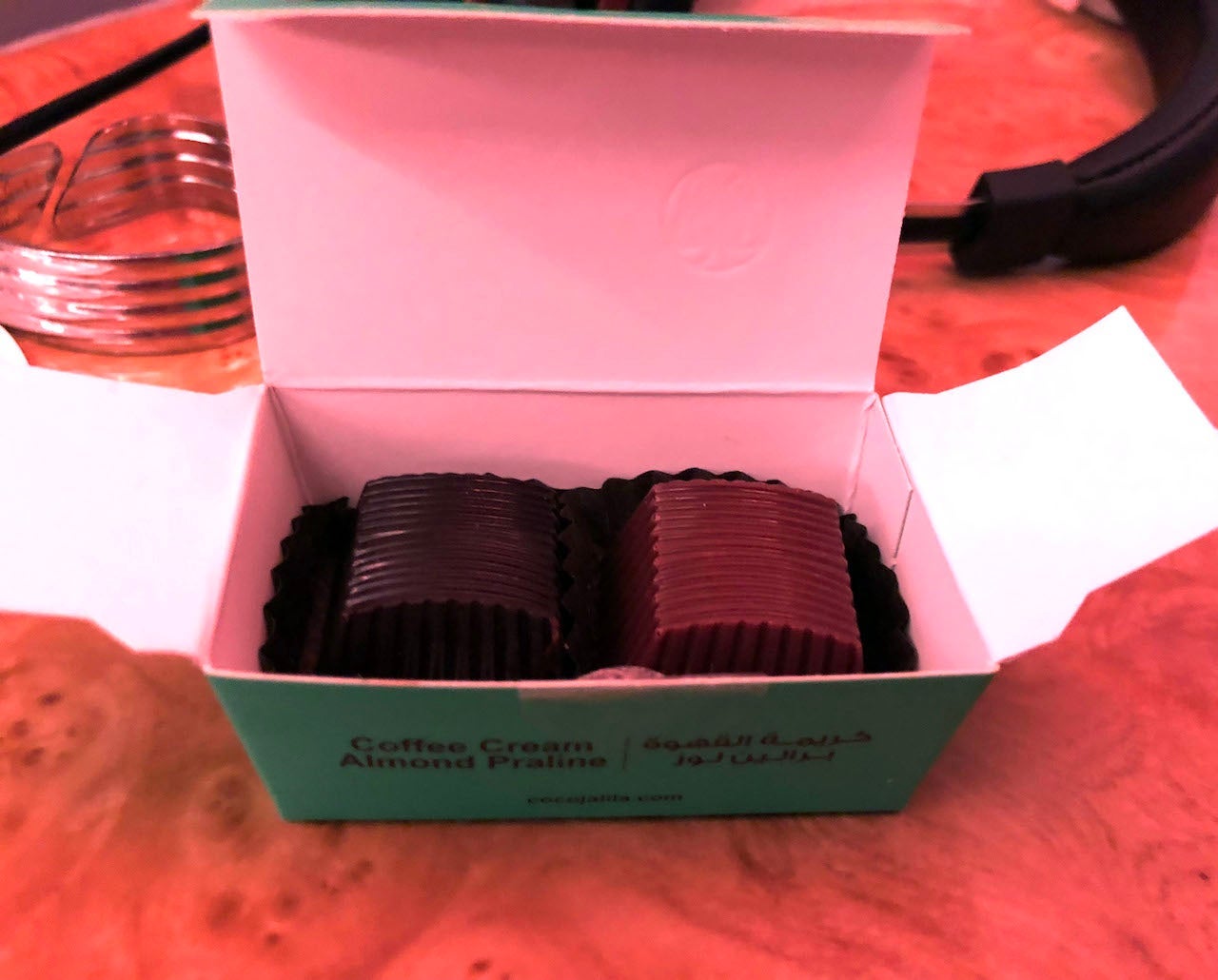 Finally, flight attendants came around with a small box of two chocolates — one dark and one milk. I saved them for later in the flight.