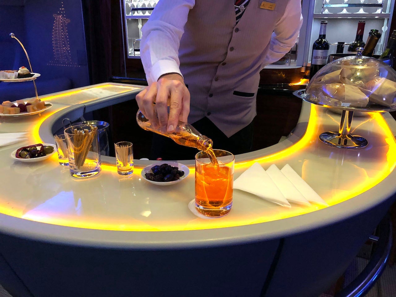 I found myself hanging in the bar/lounge area quite a bit during the flight (when I wasn't sleeping). After I finished dinner, I went back to grab an Aperol Spritz. Small finger foods of the sweet and savory variety were also on display and available to grab throughout the flight.