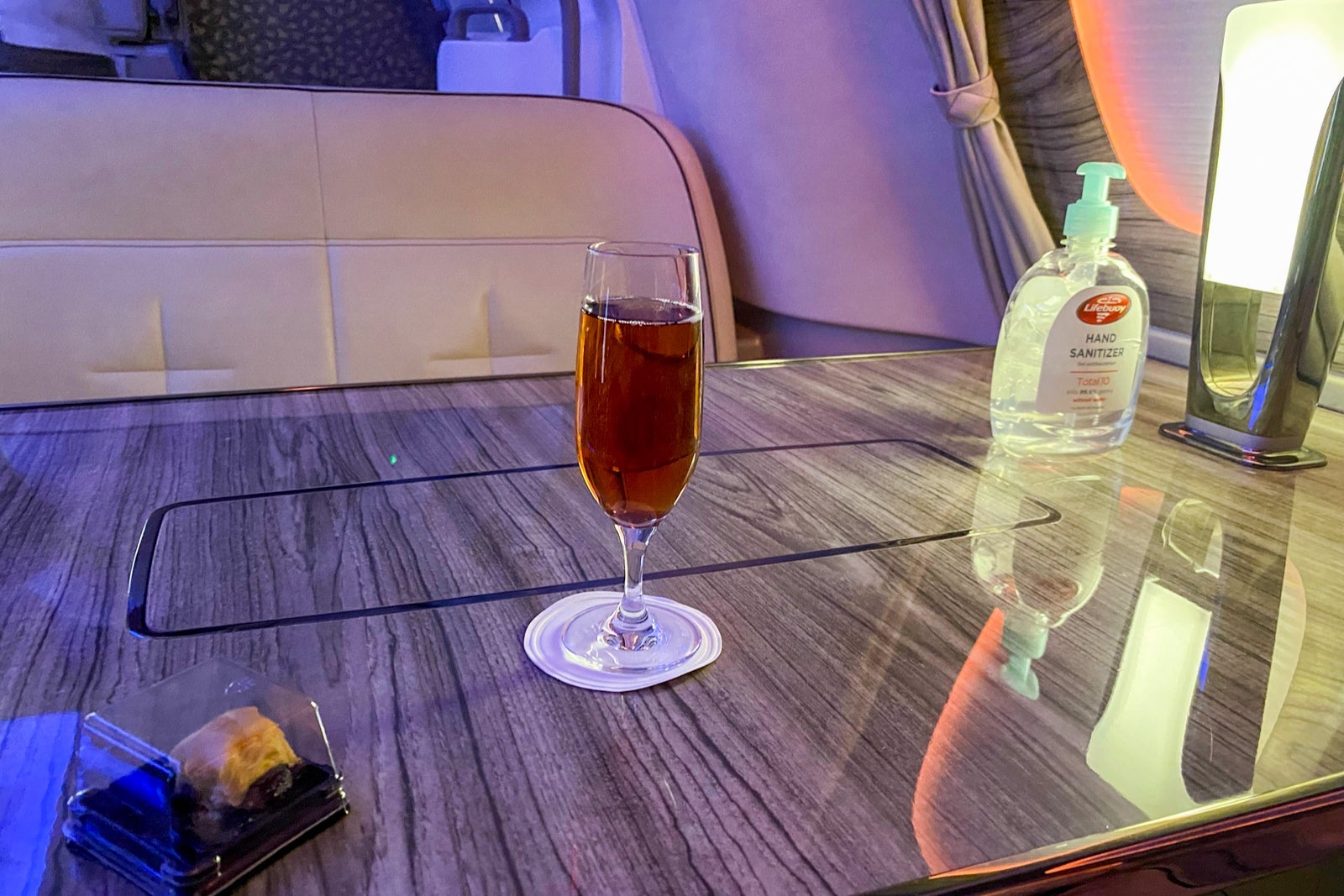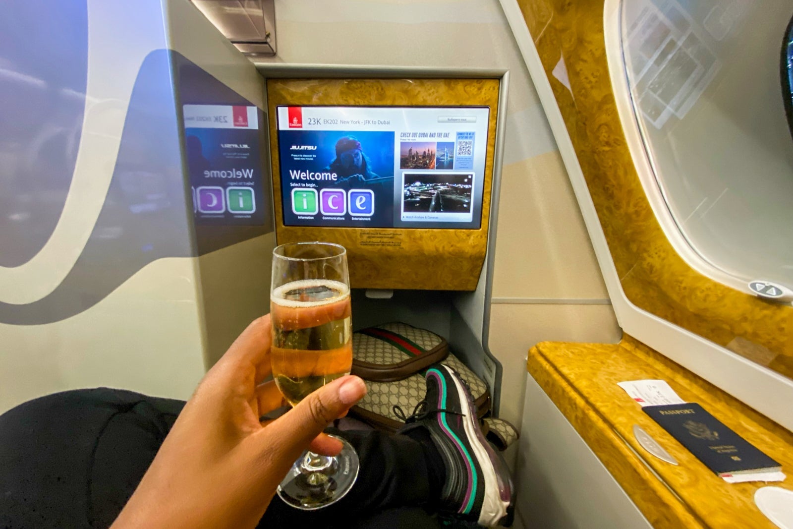 I received a pre-departure Champagne — Veuve Cliquot, if you're curious — and realized it might've been the first time I'd had real Champagne (not sparkling wine) on a plane. Clearly, things were off to a good start. Emirates offers a great drink menu, featuring cocktails (I recommend the Kir royale), beer, wine and liquor.