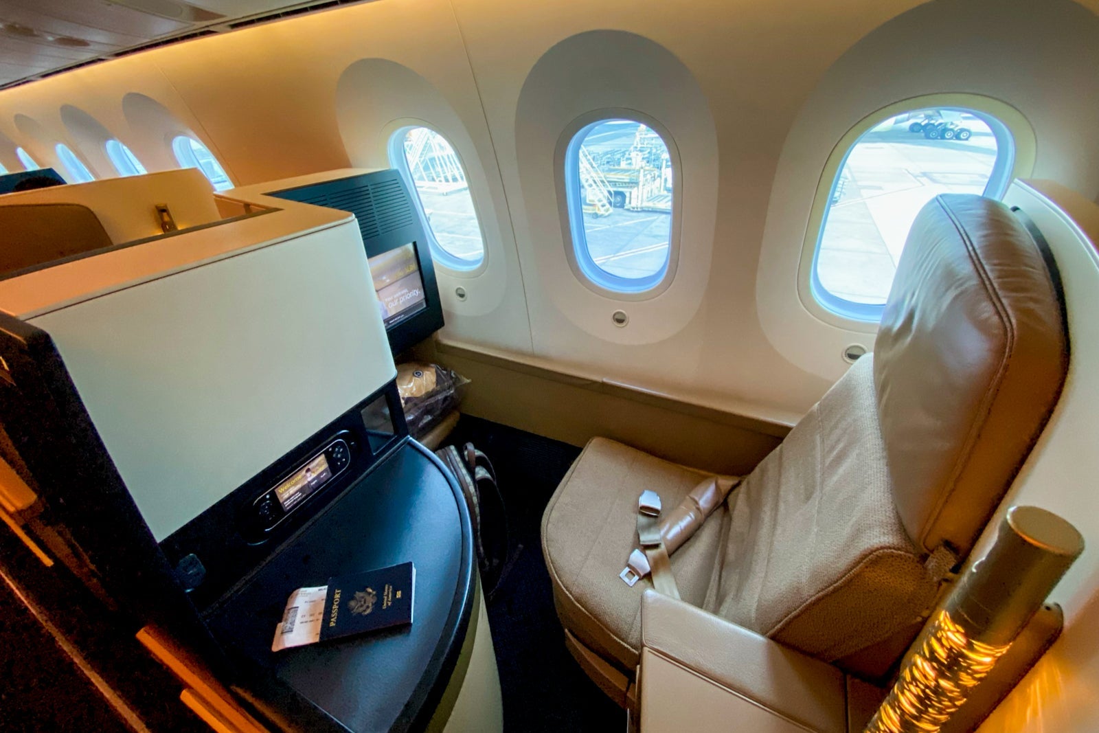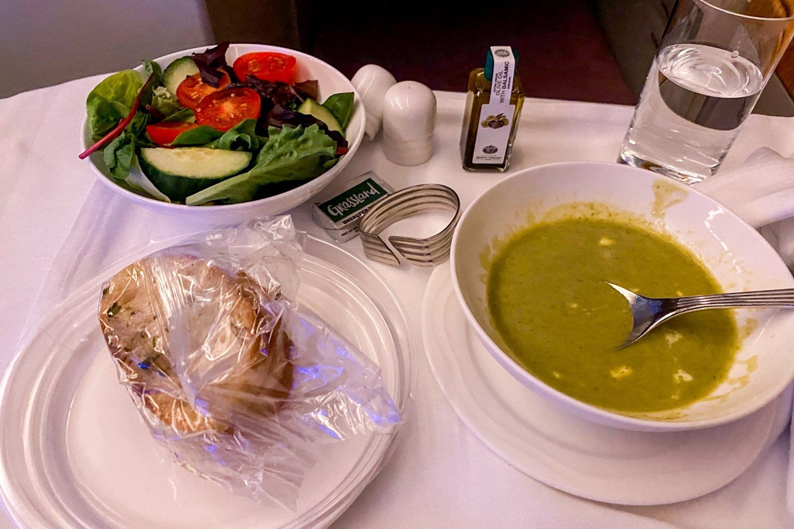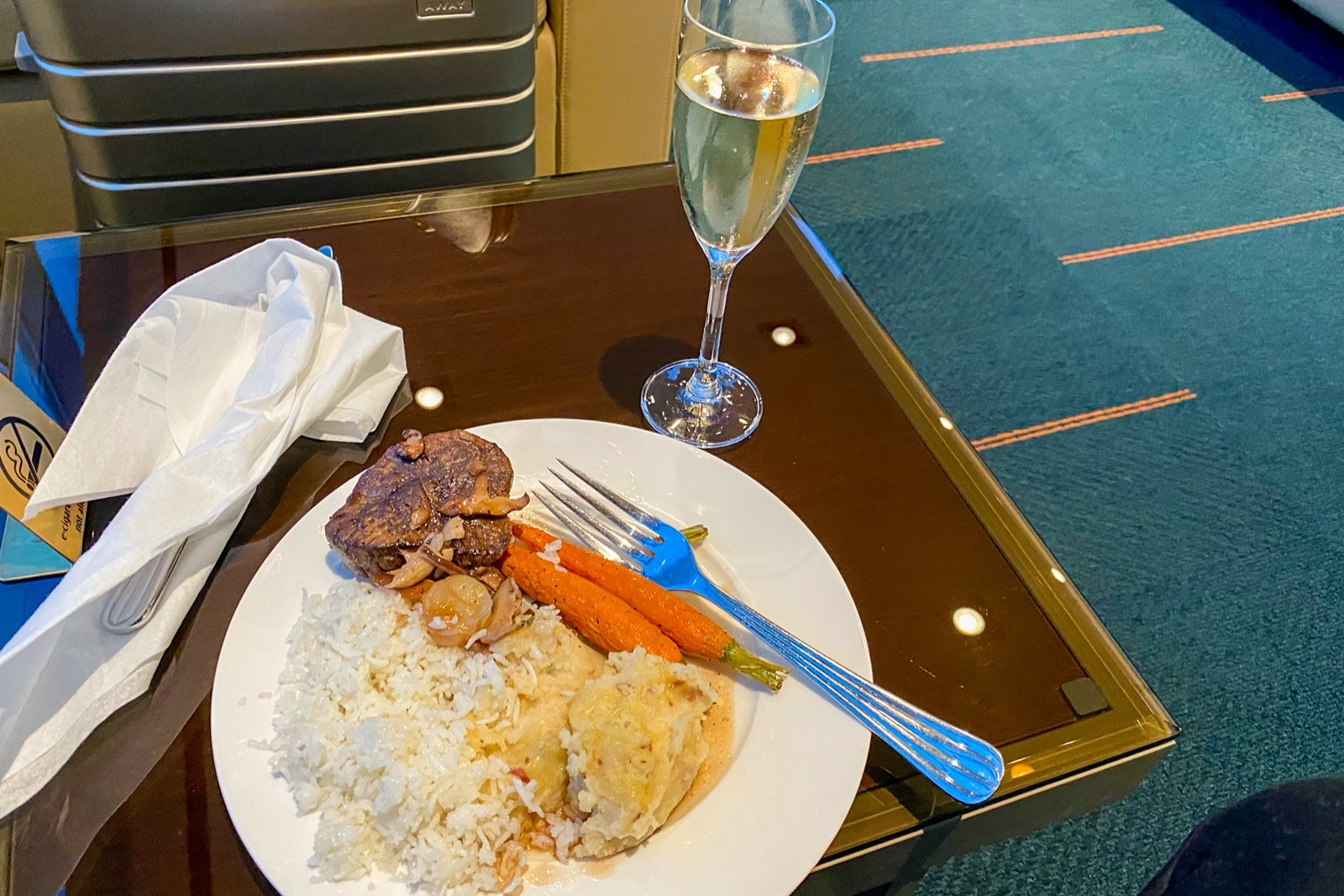 The food at the lounge was just all right, and the service was acceptable but not particularly friendly. I settled in at a window seat with a steak that was far too tough with carrots and a glass of Champagne. Ultimately, I wanted to save my appetite for the food and beverage in the air and only visited the lounge to wrap up some work before the 12-hour flight. But next time, I would probably skip the food altogether in favor of spending time at the American Express Centurion Lounge (also in Terminal 4).