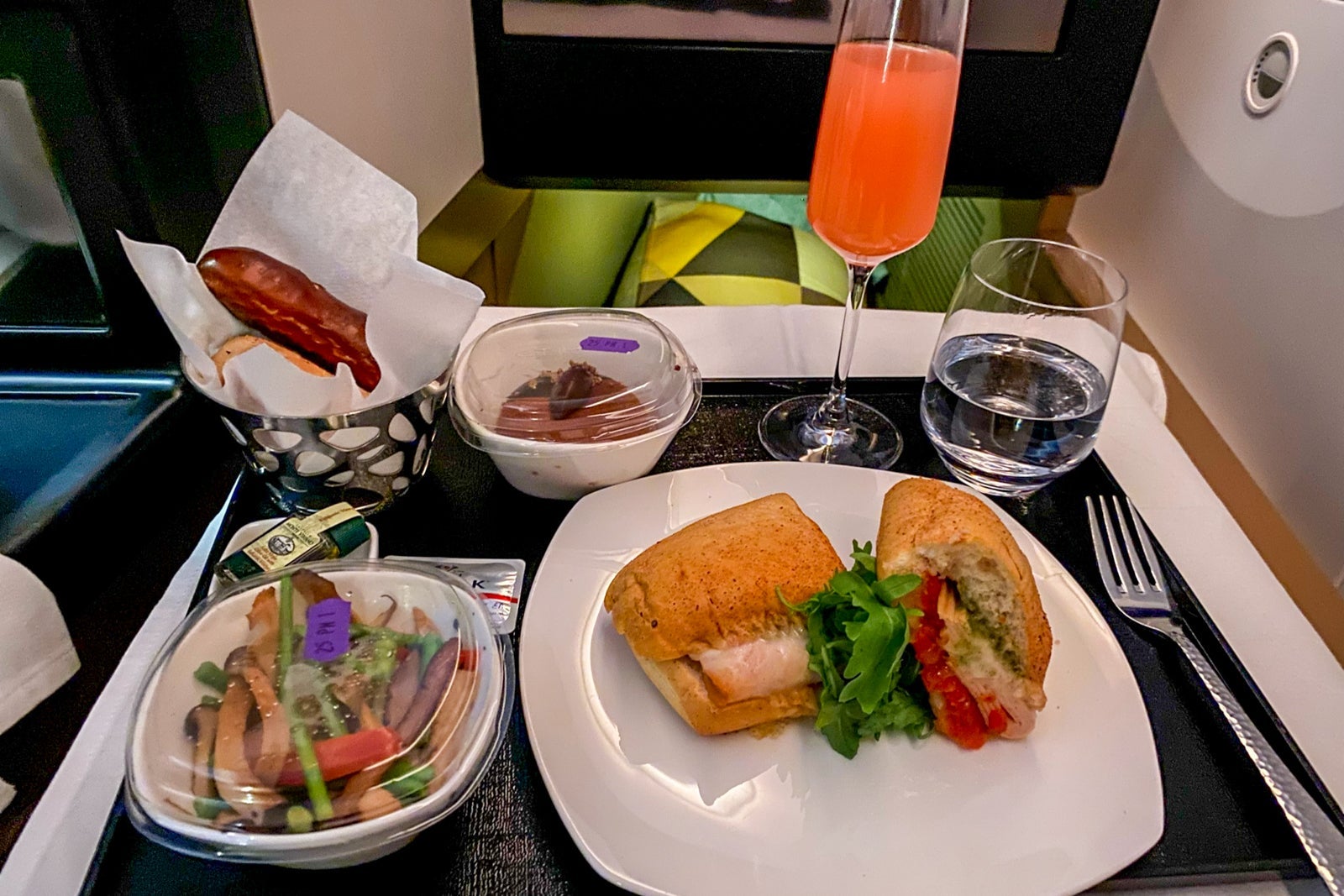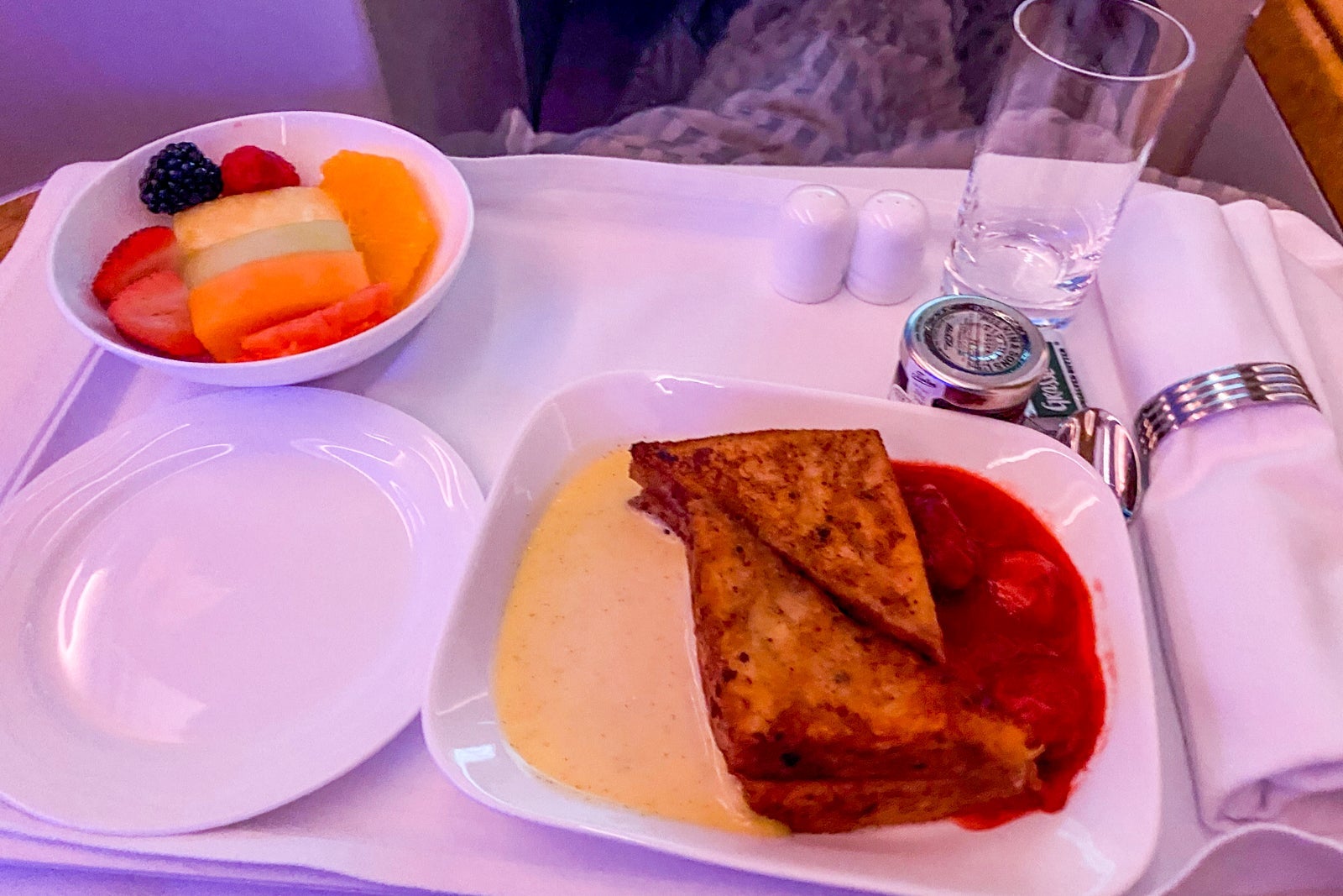 For breakfast, I opted for French toast, a fruit plate and a refreshing mimosa. I was impressed with the food and its variety, but the options can feel a little heavy on such a long-haul flight.