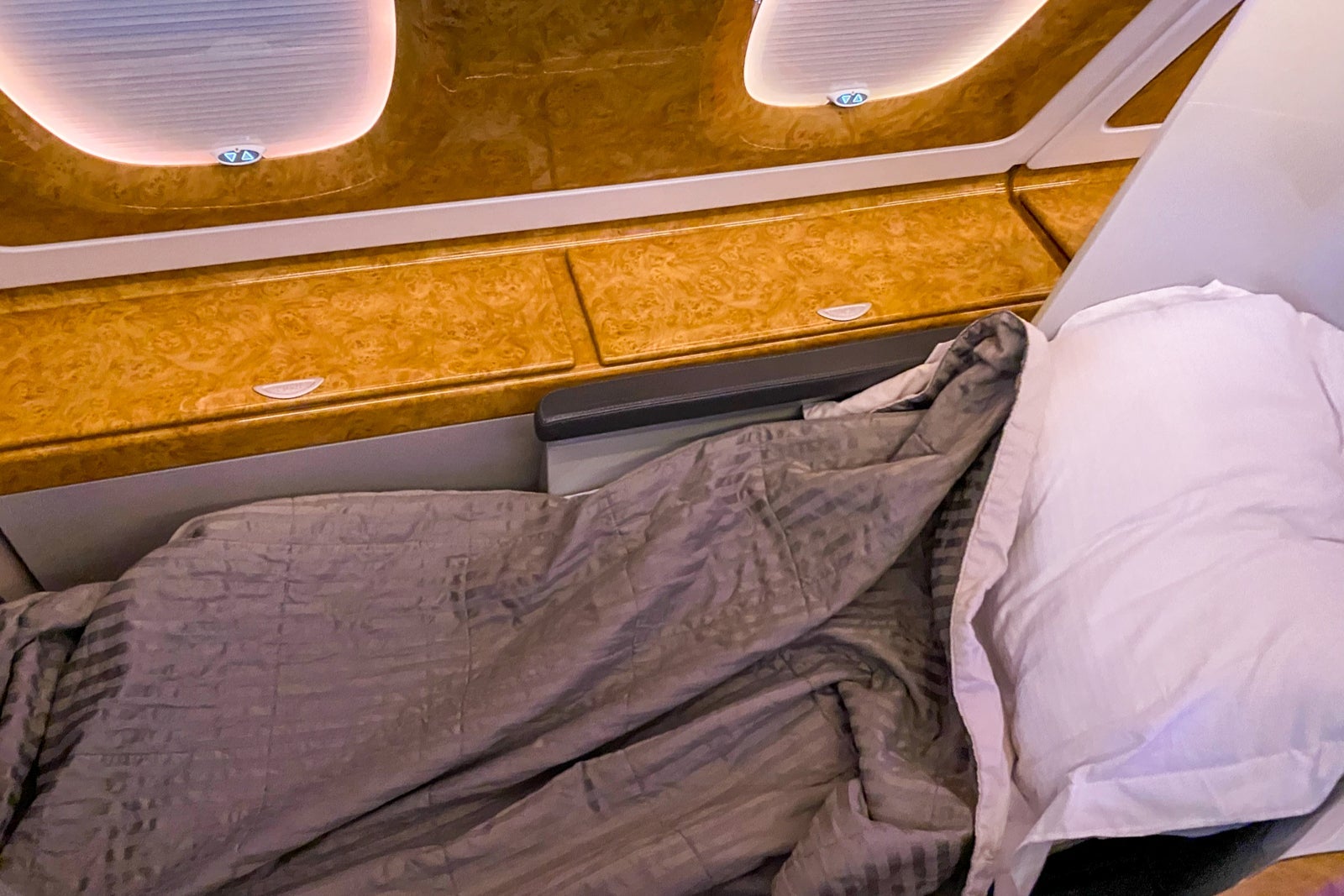 The seat itself was comfortable, though not as plush as on Emirates, even after adjusting the firmness. There was also no mattress pad like on Emirates, but the blanket and pillow were extremely comfortable.